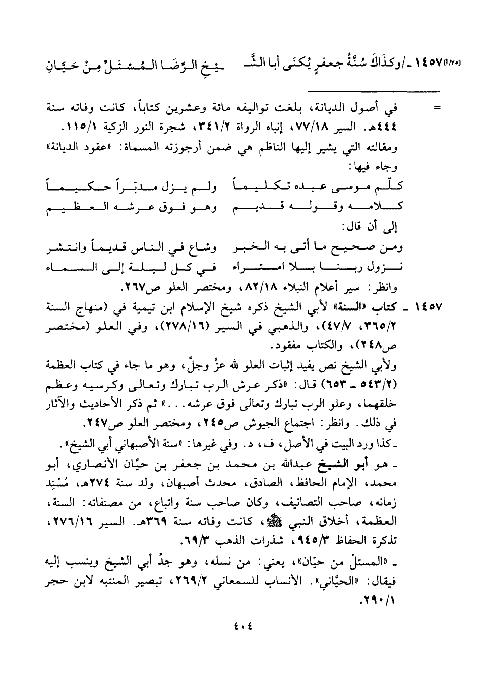 ١٤٥٧ - كتاب "السنة" لأبي الشيخ ذكره شيخ الإسلام ابن تيمية في (منهاج السنة ٢/ ٣٦٥، ٧/ ٤٧)، والذهبي في السير (١٦/ ٢٧٨)، وفي العلو (مختصر ص ٢٤٨)، والكتاب مفقود.