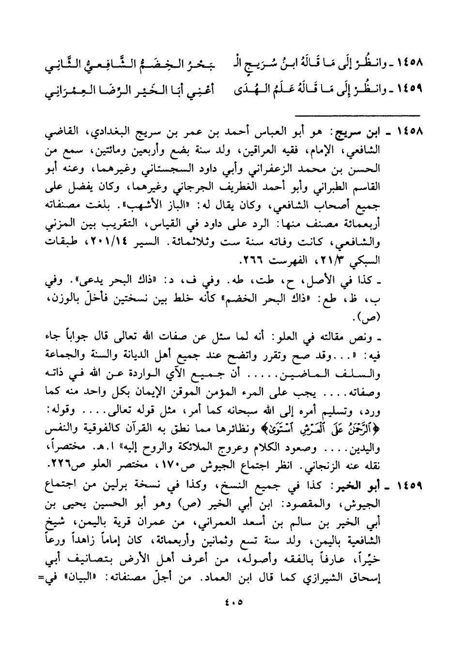 ١٤٥٩ - أبو الخير: كذا في جميع النسخ، وكذا في نسخة برلين من اجتماع الجيوش، والمقصود: ابن أبي الخير (ص) وهو أبو الحسين يحيى بن أبي الخير بن سالم بن أسعد العمراني، من عمران قرية باليمن، شيخ الشافعية باليمن، ولد سنة تسع وثمانين وأربعمائة، كان إمامًا زاهدًا ورعًا خيرًا، عارفًا بالفقه وأصوله، من أعرف أهل الأرض بتصانيف أبي إسحاق الشيرازي كما قال ابن العماد. من أجل مصنفاته: "البيان" في =