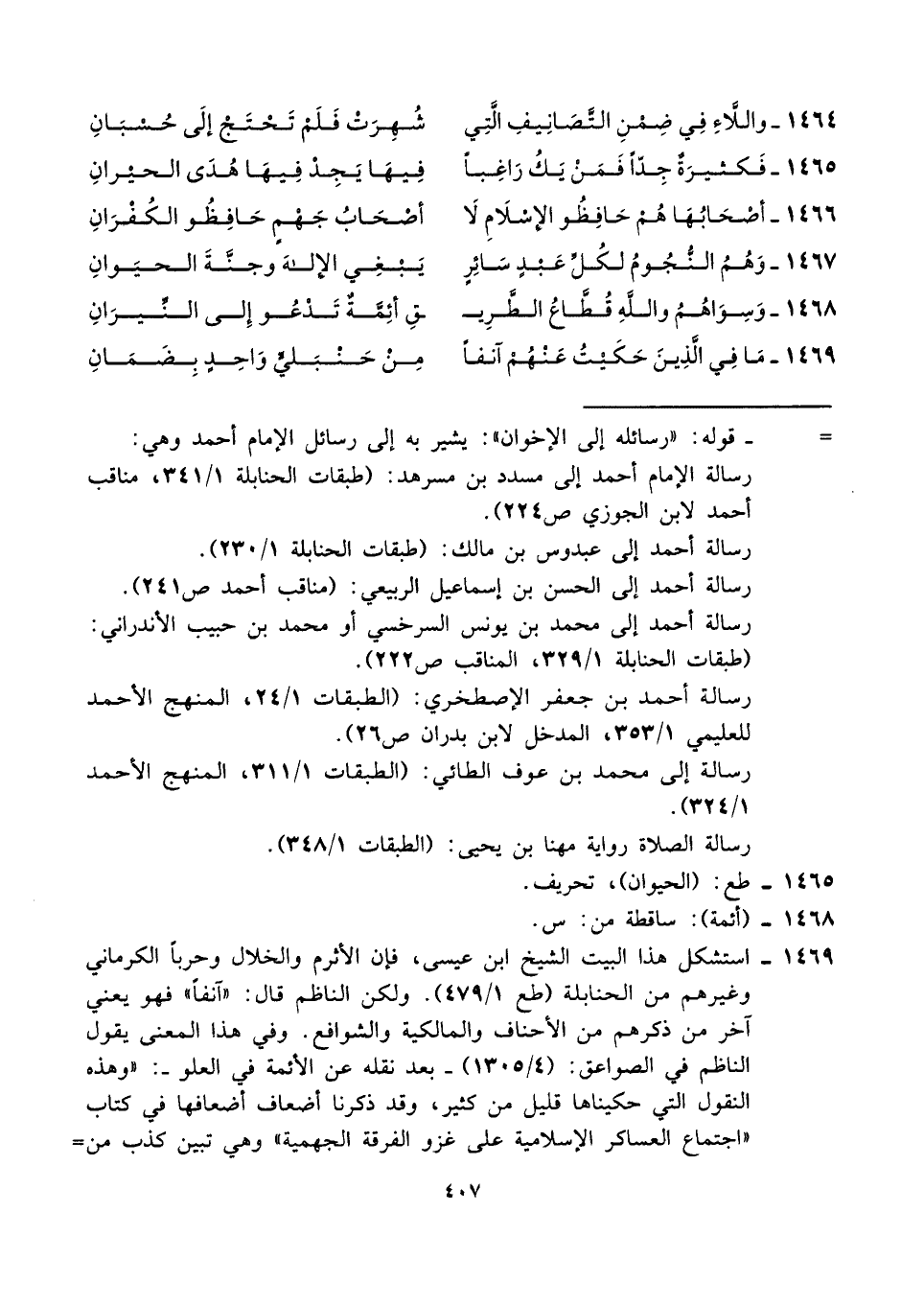 ١٤٦٩ - مَا فِي الَّذِينَ حَكَيْتُ عَنْهُم آنفًا ... مِنْ حَنْبَليٍّ وَاحِدٍ بِضَمَانِ