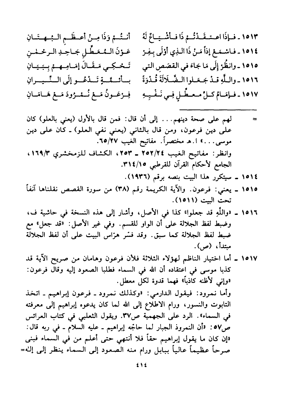 ١٥١٧ - أما اختيار الناظم لهؤلاء الثلاثة فلأن فرعون وهامان من صريح الآية قد كذبا موسى في اعتقاده أن الله في السماء فطلبا الصعود إليه وقال فرعون: "وإني لأظنه كاذبًا" فهما قدوة لكل معطل.