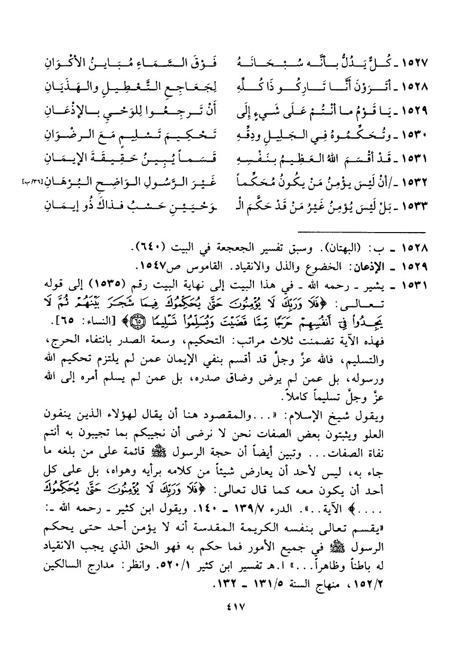 ١٥٣١ - يشير -رحمه الله- في هذا البيت إلى نهاية البيت رقم (١٥٣٥) إلى قوله تعالى: {فَلَا وَرَبِّكَ لَا يُؤْمِنُونَ حَتَّى يُحَكِّمُوكَ فِيمَا شَجَرَ بَيْنَهُمْ ثُمَّ لَا يَجِدُوا فِي أَنْفُسِهِمْ حَرَجًا مِمَّا قَضَيْتَ وَيُسَلِّمُوا تَسْلِيمًا (٦٥)} [النساء: ٦٥]. فهذه الآية تضمنت ثلاث مراتب: التحكيم، وسعة الصدر بانتفاء الحرج، والتسليم، فالله عزَّ وجلَّ قد أقسم بنفي الإيمان عمن لم يلتزم تحكيم الله ورسوله، بل عمن لم يرض وضاق صدره، بل عمن لم يسلم أمره إلى الله عزَّ وجلَّ تسليمًا كاملًا.
