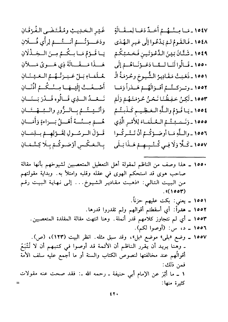 ١٥٥٠ - هذا وصف من الناظم لمقولة أهل التعطيل المتعصبين لشيوخهم بأنها مقالة صاحب هوى قد استحكم الهوى في عقله وقلبه وامتلأ به. وبداية مقولتهم من البيت التالي: "ذهبت مقادير الشيوخ ... إلى نهاية البيت رقم (١٥٥٣) ".