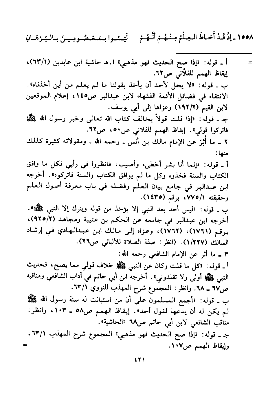جـ - قوله: "إذا قلت قولًا يخالف كتاب الله تعالى وخبر رسول الله - صلى الله عليه وسلم - فاتركوا قولي". إيقاظ الهمم للفلاني ص ٥٠، ص ٦٢.