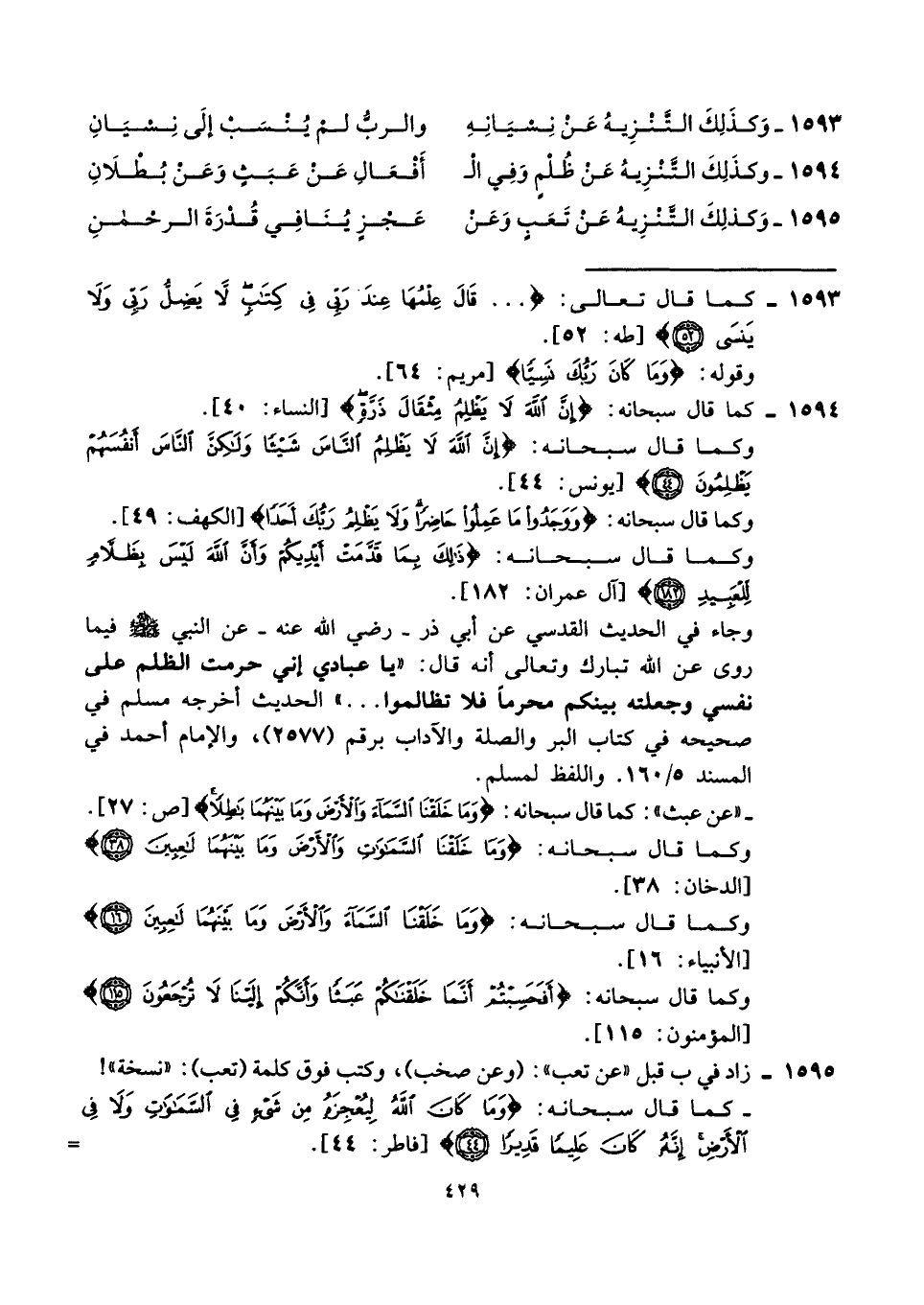 ١٥٩٤ - وكذَلِكَ التَّنْزِيهُ عَنْ ظُلْمٍ وَفِي الْـ ... أَفْعَالِ عَنْ عَبَثٍ وَعَنْ بُطْلَانِ