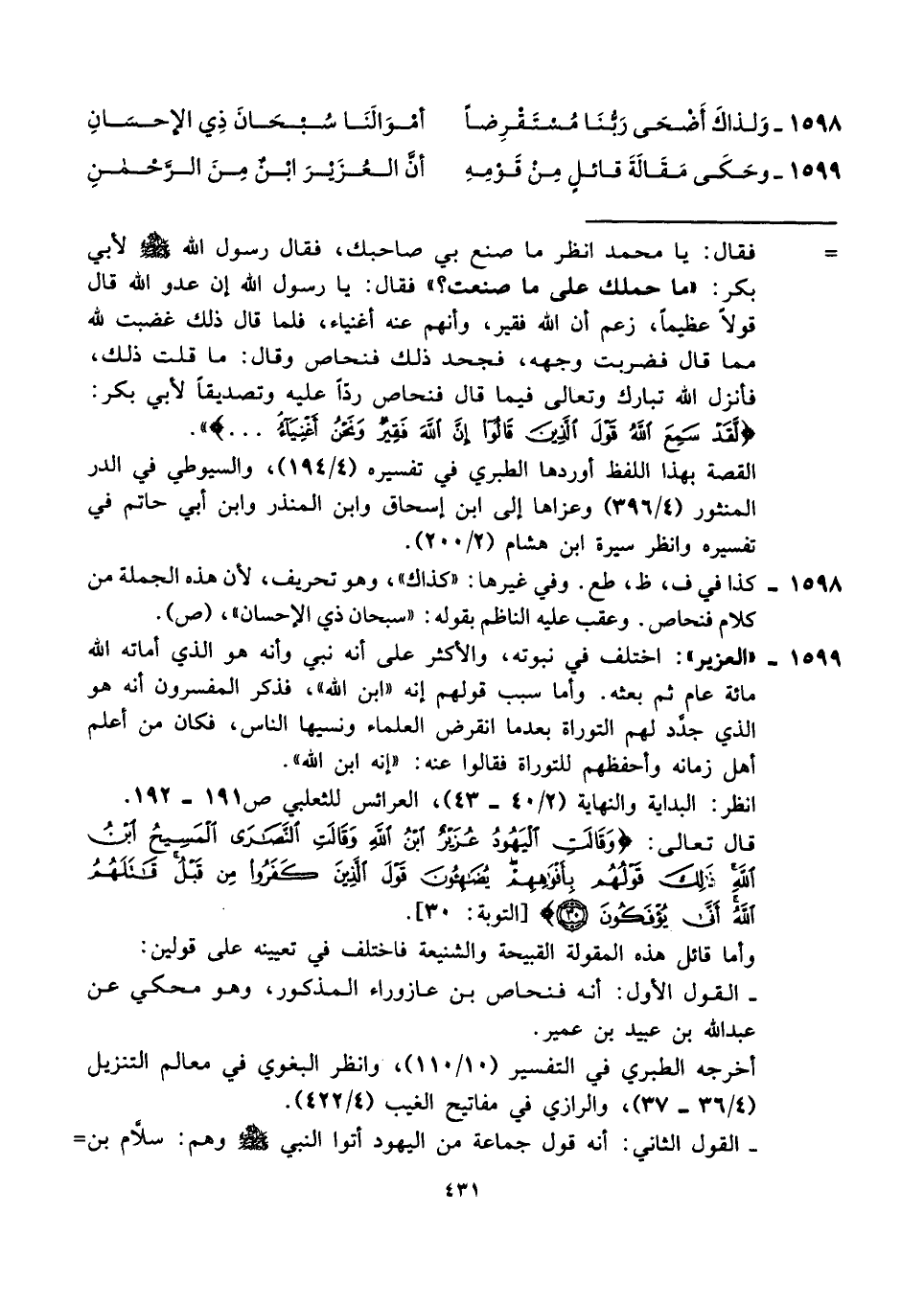 ١٥٩٨ - كذا في ف، ظ، طع. وفي غيرها: "كذاك"، وهو تحريف، لأن هذه الجملة من كلام فنحاص. وعقب عليه الناظم بقوله: "سبحان ذي الإحسان"، (ص).