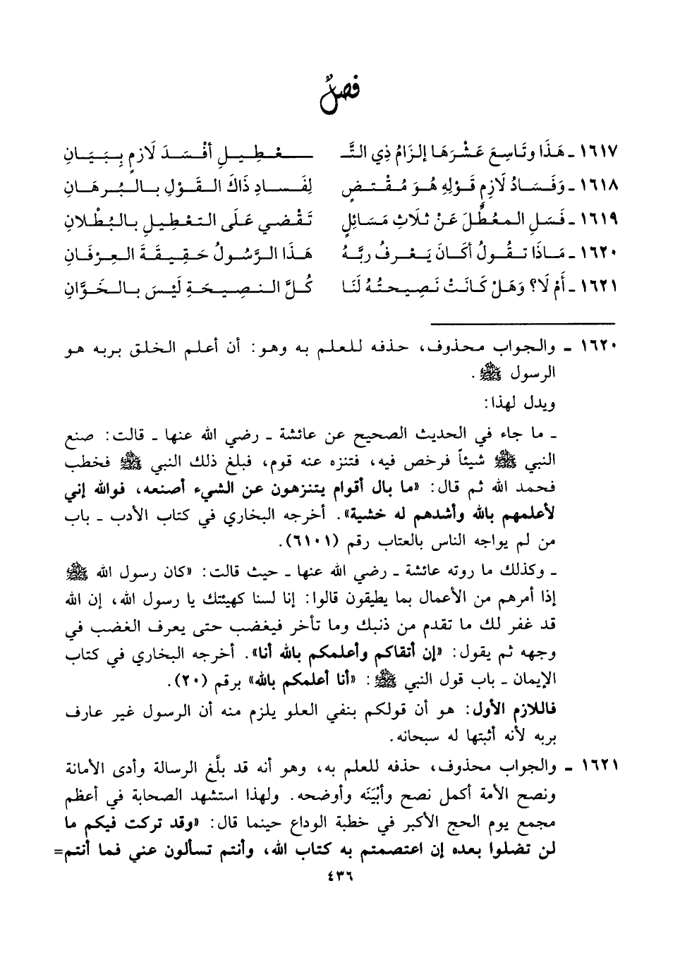١٦١٧ - هَذَا وتَاسِعَ عَشْرَهَا إلزَامُ ذِي التَّـ ... ـعْطِيلِ أفْسَدَ لَازمٍ بِبَيَانِ