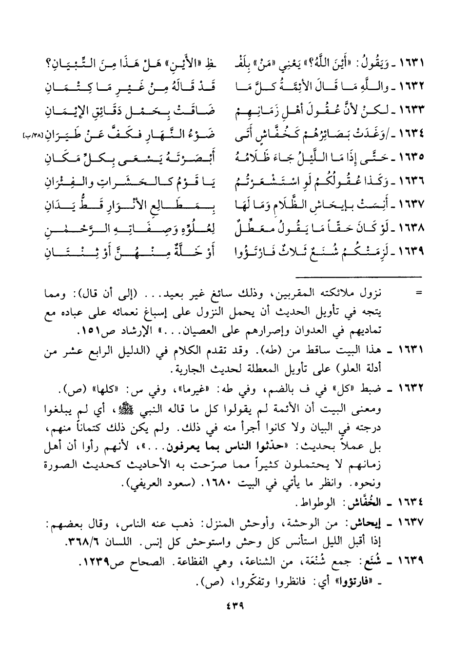 ١٦٣٤ - وَغَدَتْ بَصائِرُهُم كَخُفَّاشٍ أَتَى ... ضَوْءُ النَّهَارِ فكَفَّ عَنْ طَيَرَانِ