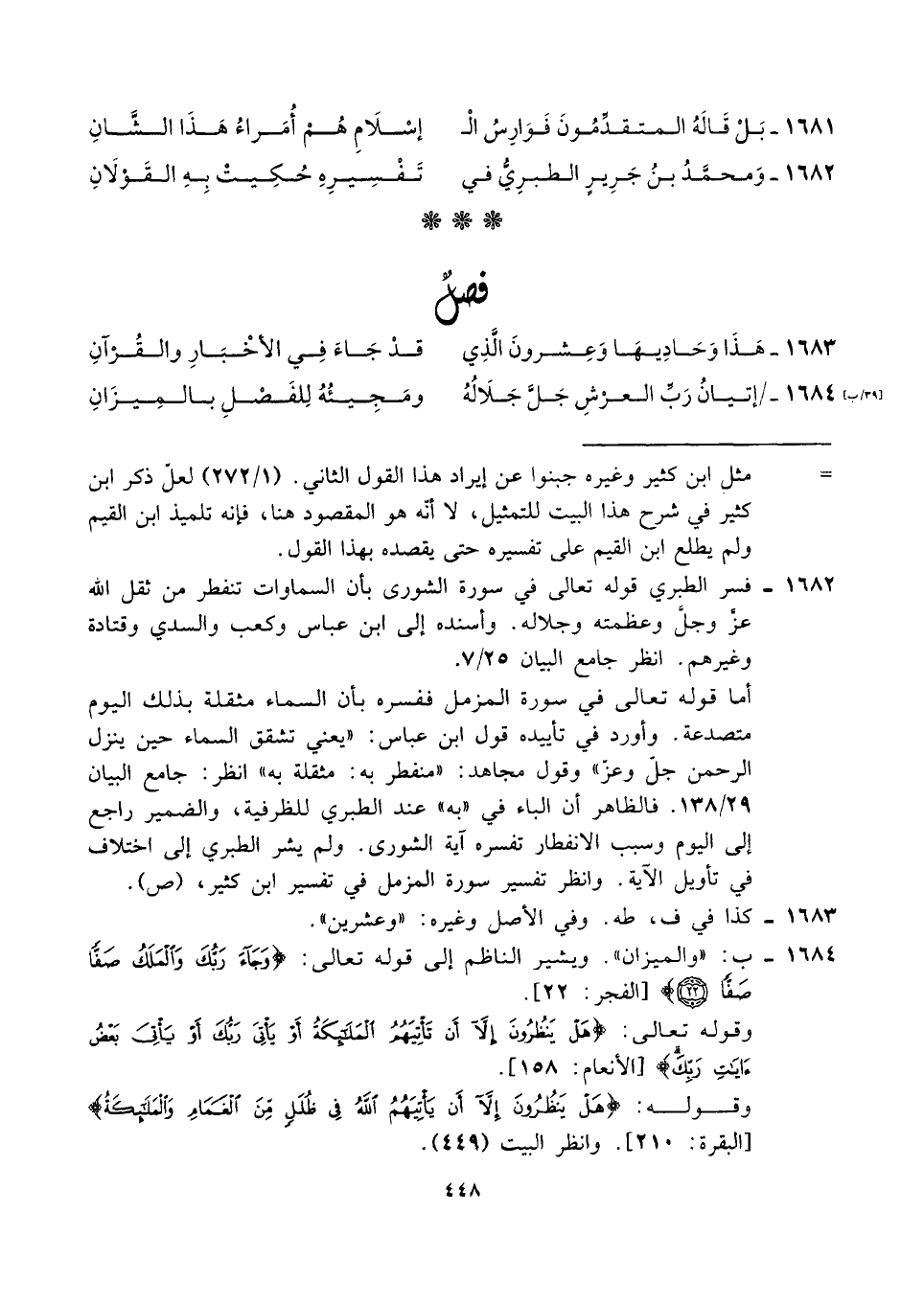 ١٦٨٢ - فسر الطبري قوله تعالى في سورة الشورى بأن السماوات تنفطر من ثقل الله عزَّ وجلَّ وعظمته وجلاله. وأسنده إلى ابن عباس وكعب والسدي وقتادة وغيرهم. انظر جامع البيان ٢٥/ ٧.