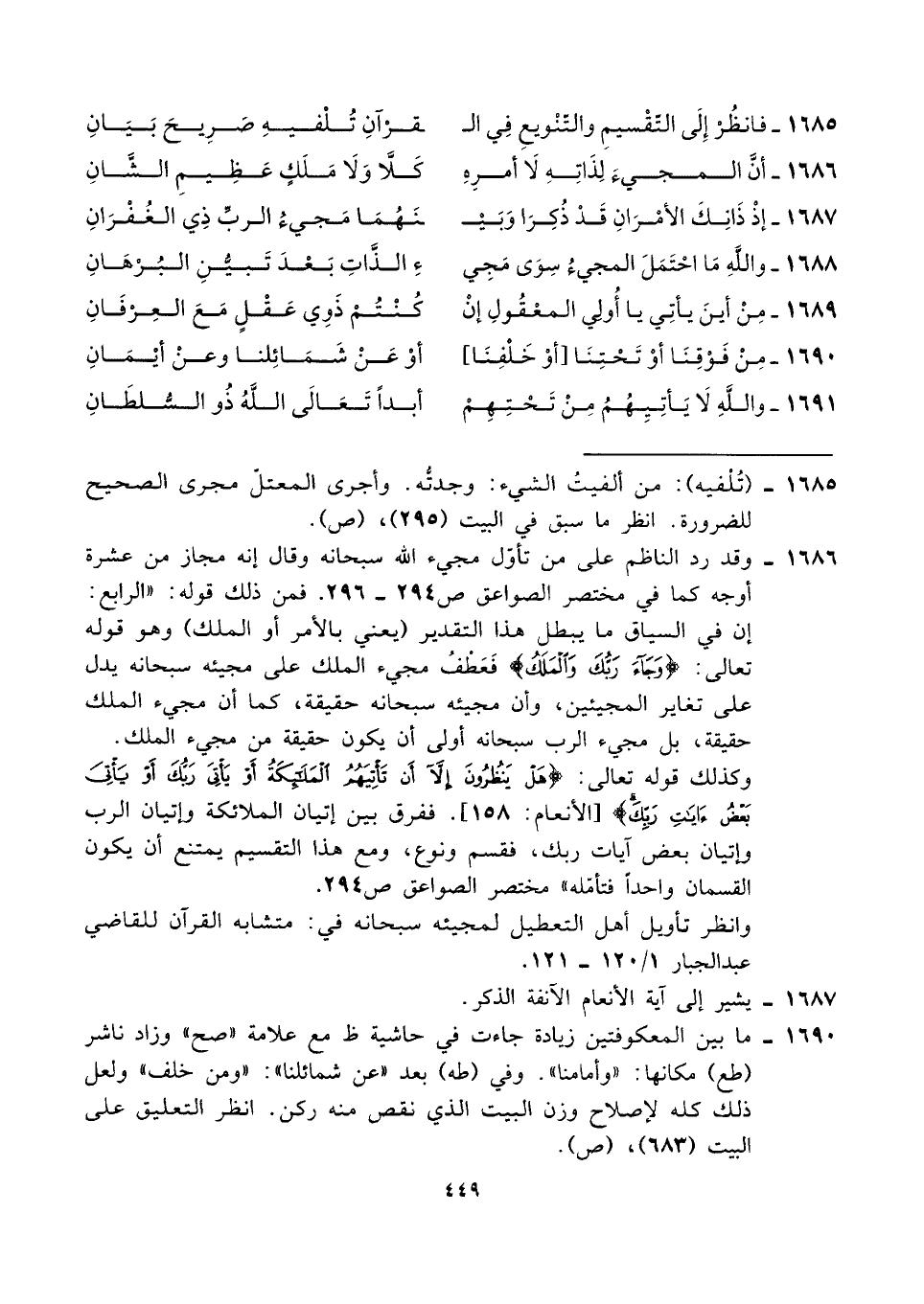 ١٦٨٦ - وقد رد الناظم على من تأوّل مجيء الله سبحانه وقال إنه مجاز من عشرة أوجه كما في مختصر الصواعق ص ٢٩٤ - ٢٩٦. فمن ذلك قوله: "الرابع: إن في السياق ما يبطل هذا التقدير (يعني بالأمر أو الملك) وهو قوله تعالى: {وَجَاءَ رَبُّكَ وَالْمَلَكُ} فَعَطْفُ مجيء الملك على مجيئه سبحانه يدل على تغاير المجيئين، وأن مجيئه سبحانه حقيقة، كما أن مجيء الملك حقيقة، بل مجيء الرب سبحانه أولى أن يكون حقيقة من مجيء الملك.