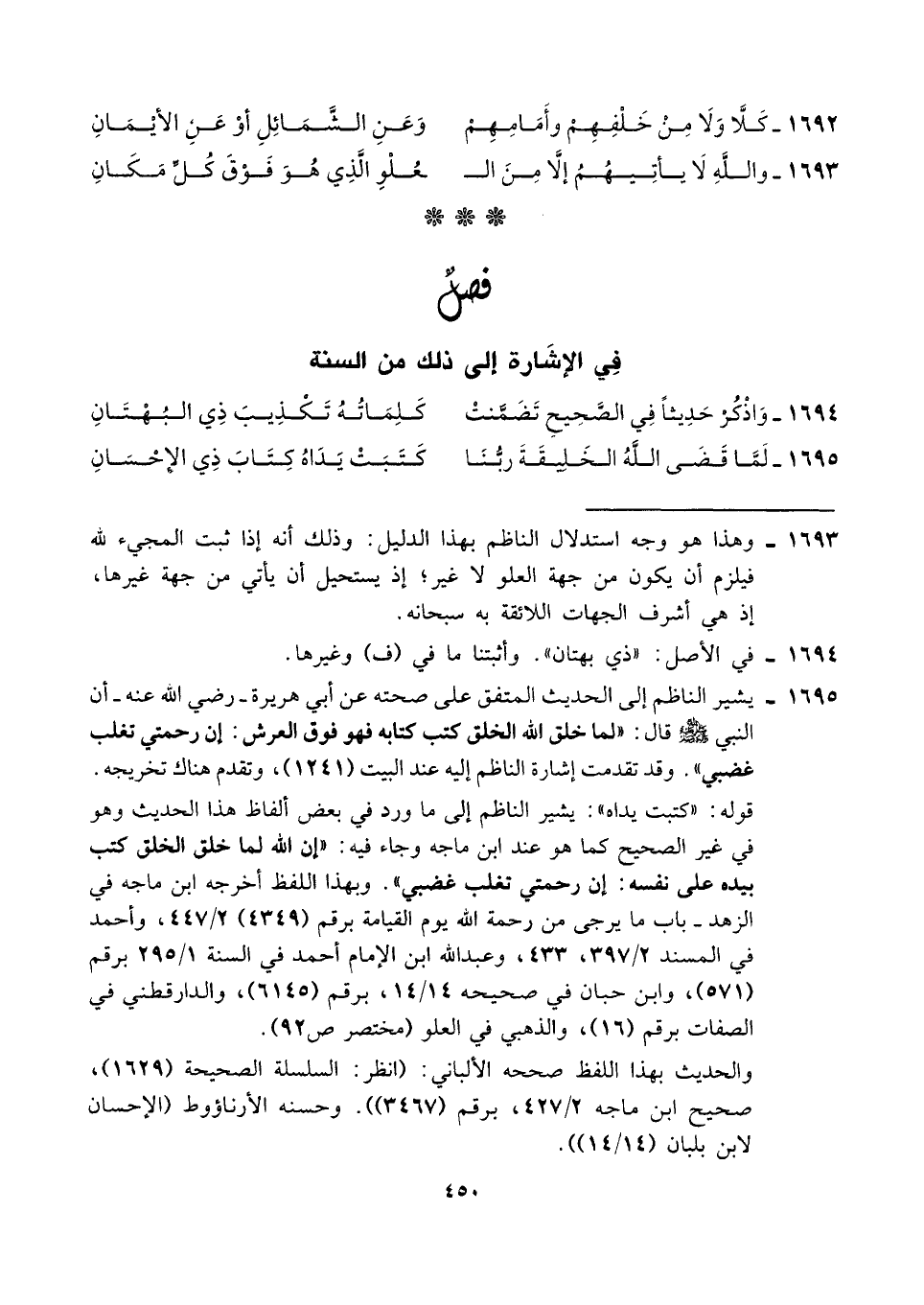 ١٦٩٥ - يشير الناظم إلى الحديث المتفق على صحته عن أبي هريرة -رضي الله عنه- أن النبي - صلى الله عليه وسلم -قال: "لما خلق الله الخلق كتب كتابه فهو فوق العرش: إن رحمتي تغلب غضبي". وقد تقدمت إشارة الناظم إليه عند البيت (١٢٤١)، وتقدم هناك تخريجه.
