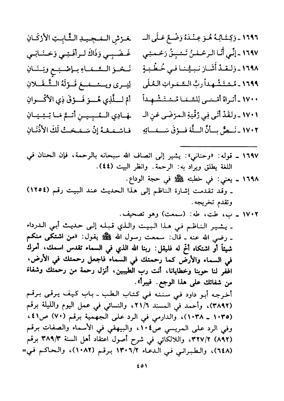 ١٦٩٧ - قوله: "وحناني": يشير إلى اتصاف الله سبحانه بالرحمة، فإن الحنان في اللغة يطلق ويراد به: الرحمة. وانظر البيت (٤٤).