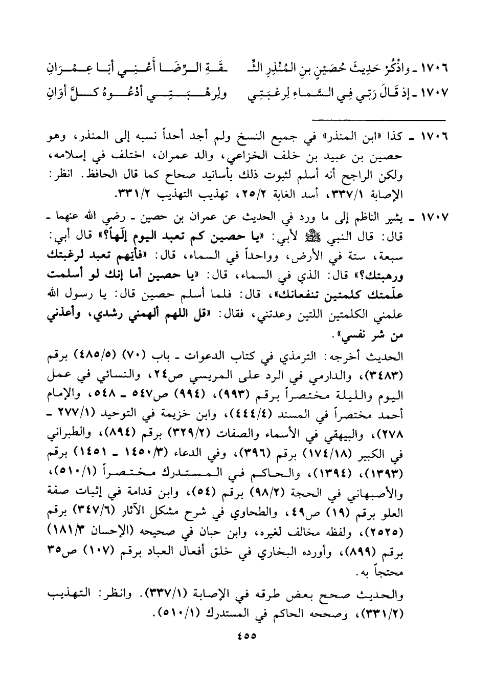 ١٧٠٧ - يشير الناظم إلى ما ورد في الحديث عن عمران بن حصين -رضي الله عنهما- قال: قال النبي - صلى الله عليه وسلم - لأبي: "يا حصين كم تعبد اليوم إلهًا؟ " قال أبي: سبعة، ستة في الأرض، وواحدًا في السماء، قال: "فأيّهم تعبد لرغبتك ورهبتك؟ " قال: الذي في السماء، قال: "يا حصين أما إنك لو أسلمت علّمتك كلمتين تنفعانك"، قال: فلما أسلم حصين قال: يا رسول الله علمني الكلمتين اللتين وعدتني، فقال: "قل اللهم ألهمني رشدي، وأعذني من شر نفسي".