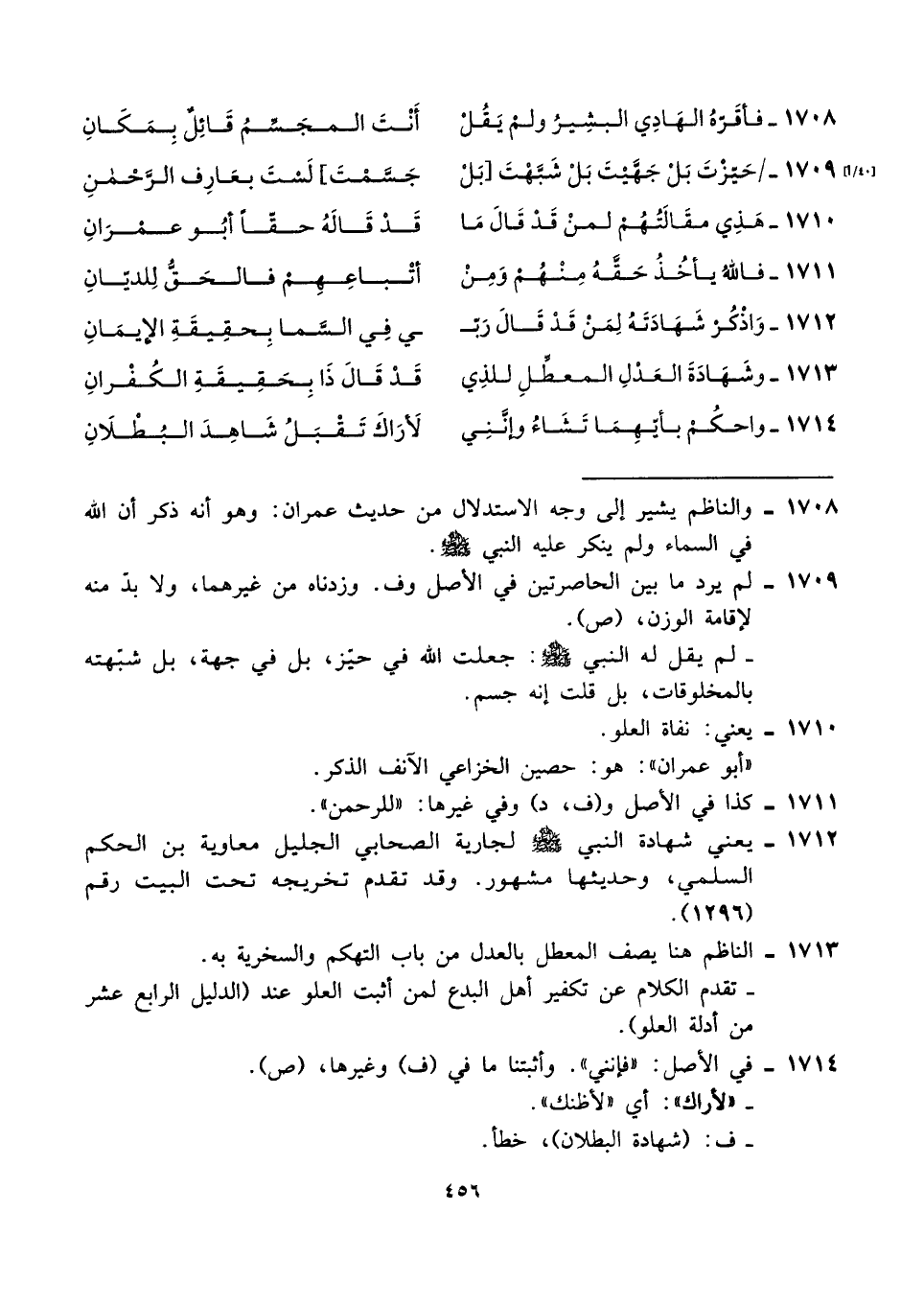 ١٧٠٨ - والناظم يشير إلى وجه الاستدلال من حديث عمران: وهو أنه ذكر أن الله في السماء ولم ينكر عليه النبي - صلى الله عليه وسلم -.