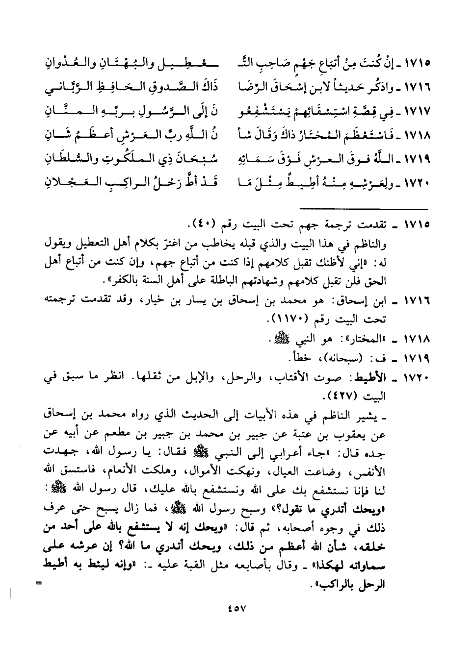 - يشير الناظم في هذه الأبيات إلى الحديث الذي رواه محمد بن إسحاق عن يعقوب بن عتبة عن جبير بن محمد بن جبير بن مطعم عن أبيه عن جده قال: "جاء أعرابي إلى النبي - صلى الله عليه وسلم - فقال: يا رسول الله، جهدت الأنفس، وضاعت العيال، ونهكت الأموال، وهلكت الأنعام، فاستسق الله لنا فإنا نستشفع بك على الله ونستشفع بالله عليك، قال رسول الله - صلى الله عليه وسلم -: "ويحك أتدري ما تقول؟ " وسبح رسول الله - صلى الله عليه وسلم -، فما زال يسبح حتى عرف ذلك في وجوه أصحابه، ثم قال: "ويحك إنه لا يستشفع بالله على أحد من خلقه، شأن الله أعظم من ذلك، ويحك أندري ما الله؟ إن عرشه على سماواته لهكذا" -وقال بأصابعه مثل القبة عليه-: "وإنه ليئط به أطيط الرحل بالراكب".=