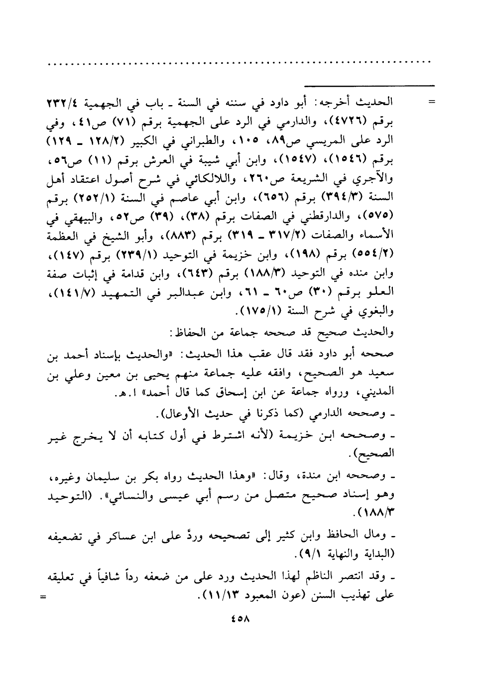 = الحديث أخرجه: أبو داود في سننه في السنة - باب في الجهمية ٤/ ٢٣٢ برقم (٤٧٢٦)، والدارمي في الرد على الجهمية برقم (٧١) ص ٤١، وفي الرد على المريسي ص ٨٩، ١٠٥، والطبراني في الكبير (٢/ ١٢٨ - ١٢٩) برقم (١٥٤٦)، (١٥٤٧)، وابن أبي شيبة في العرش برقم (١١) ص ٥٦، والآجري في الشريعة ص ٢٦٠، واللالكائي في شرح أصول اعتقاد أهل السنة (٣/ ٣٩٤) برقم (٦٥٦)، وابن أبي عاصم في السنة (١/ ٢٥٢) برقم (٥٧٥)، والدارقطني في الصفات برقم (٣٨)، (٣٩) ص ٥٢، والبيهقي في الأسماء والصفات (٢/ ٣١٧ - ٣١٩) برقم (٨٨٣)، وأبو الشيخ في العظمة ( ٢/ ٥٥٤ ) برقم (١٩٨)، وابن خزيمة في التوحيد (١/ ٢٣٩) برقم (١٤٧)، وابن منده في التوحيد (٣/ ١٨٨) برقم (٦٤٣)، وابن قدامة في إثبات صفة العلو برقم (٣٠) ص ٦٥ - ٦١، وابن عبد البر في التمهيد (٧/ ١٤١)، والبغوي في شرح السنة (١/ ١٧٥).