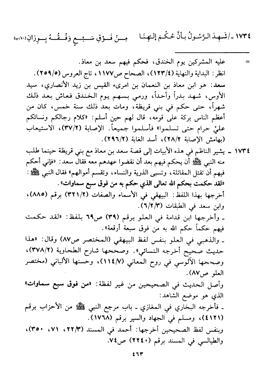 ١٧٣٤ - يشير الناظم في هذه الأبيات إلى قصة سعد بن معاذ مع بني قريظة حينما طلب منه النبي - صلى الله عليه وسلم - أن يحكم فيهم بعد أن نقضوا عهدهم معه فقال سعد: "فإني أحكم فيهم أن تقتل المقاتلة، وتسبى الذرية والنساء، وتقسم أموالهم" فقال النبي - صلى الله عليه وسلم -: "لقد حكمت بحكم الله تعالى الذي حكم به من فوق سبع سماوات".