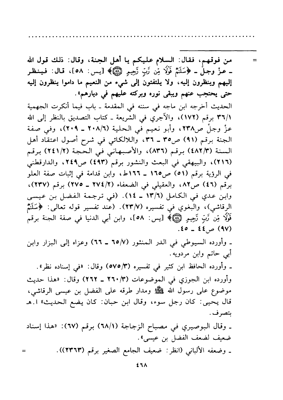 الحديث أخرجه ابن ماجه في سننه في المقدمة - باب فيما أنكرت الجهمية ٣٦١١ برقم (١٧٢)، والآجري في الشريعة - كتاب التصديق بالنظر إلى الله عزَّ وجلَّ ص ٢٣٨، وأبو نعيم في الحلية (٦/ ٢٠٨ - ٢٠٩)، وفي صفة الجنة برقم (٩١) ص ٣٥ - ٣٦، واللالكائي في شرح أصول اعتقاد أهل السنة (٣/ ٤٨٢) برقم ٨٣٦١)، والأصبهاني في الحجة (٢/ ٢٤١) برقم (٢١٦)، والبيهقي في البعث والنشور برقم (٤٩٣) ص ٢٤٩، والدارقطني في الرؤية برقم (٥١) ص ١٦٥ - ١٦٦ ط، وابن قدامة في إثبات صفة العلو برقم (٤٦) ص ٨٢، والعقيلي في الضعفاء (٢/ ٢٧٤ - ٢٧٥) برقم (٢٣٧)، وابن عدي في الكامل (٦/ ١٣ - ١٤). (في ترجمة الفضل بن عيسى الرقاشي)، والبغوي في تفسيره (٧/ ٢٣). (عند تفسير قوله تعالى: {سَلَامٌ قَوْلًا مِنْ رَبٍّ رَحِيمٍ (٥٨)} [يس: ٥٨]، وابن أبي الدنيا في صفة الجنة برقم (٩٧) ص ٤٤ - ٤٥.