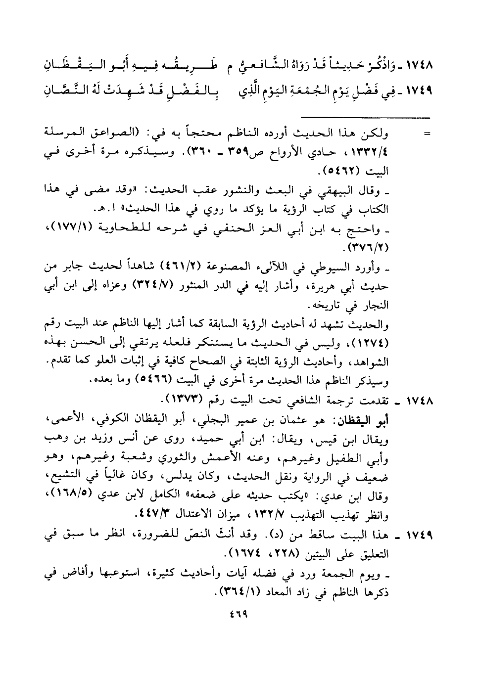 والحديث تشهد له أحاديث الرؤية السابقة كما أشار إليها الناظم عند البيت رقم (١٢٧٤)، وليس في الحديث ما يستنكر فلعله يرتقي إلى الحسن بهذه الشواهد، وأحاديث الرؤية الثابتة في الصحاح كافية في إثبات العلو كما تقدم.