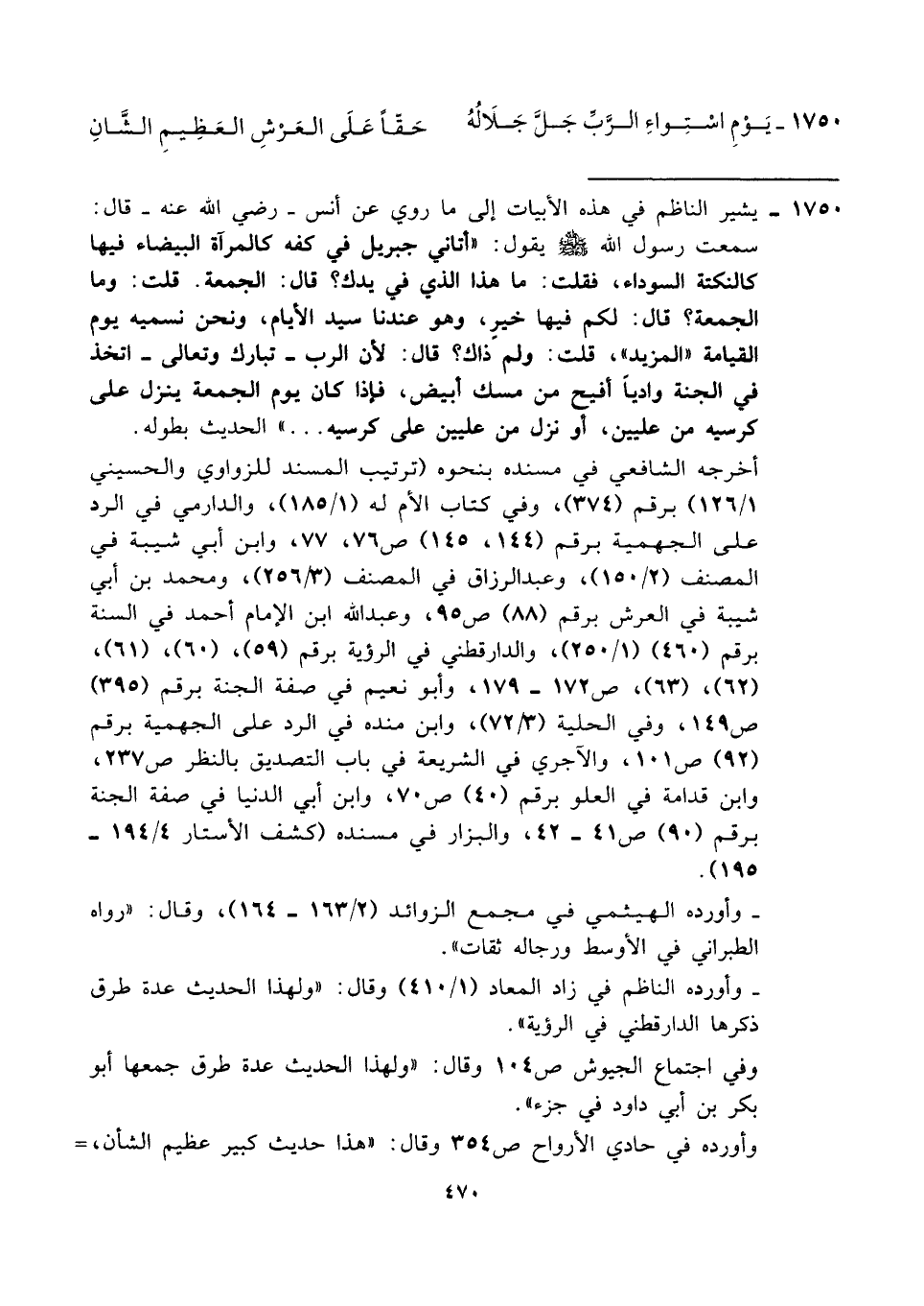 ١٧٥٠ - يشير الناظم في هذه الأبيات إلى ما روي عن أنس -رضي الله عنه- قال: سمعت رسول الله - صلى الله عليه وسلم - يقول: "أتاني جبريل في كفه كالمرآة البيضاء فيها كالنكتة السوداء، فقلت: ما هذا الذي في يدك؟ قال: الجمعة. قلت: وما الجمعة؟ قال: لكم فيها خير، وهو عندنا سيد الأيام، ونحن نسميه يوم القيامة "المزيد"، قلت: ولم ذاك؟ قال: لأن الرب -تبارك وتعالى- اتخذ في الجنة واديًا أفيح من مسك أبيض، فإذا كان يوم الجمعة ينزل على كرسيه من عليين، أو نزل من عليين على كرسيه ... " الحديث بطوله.