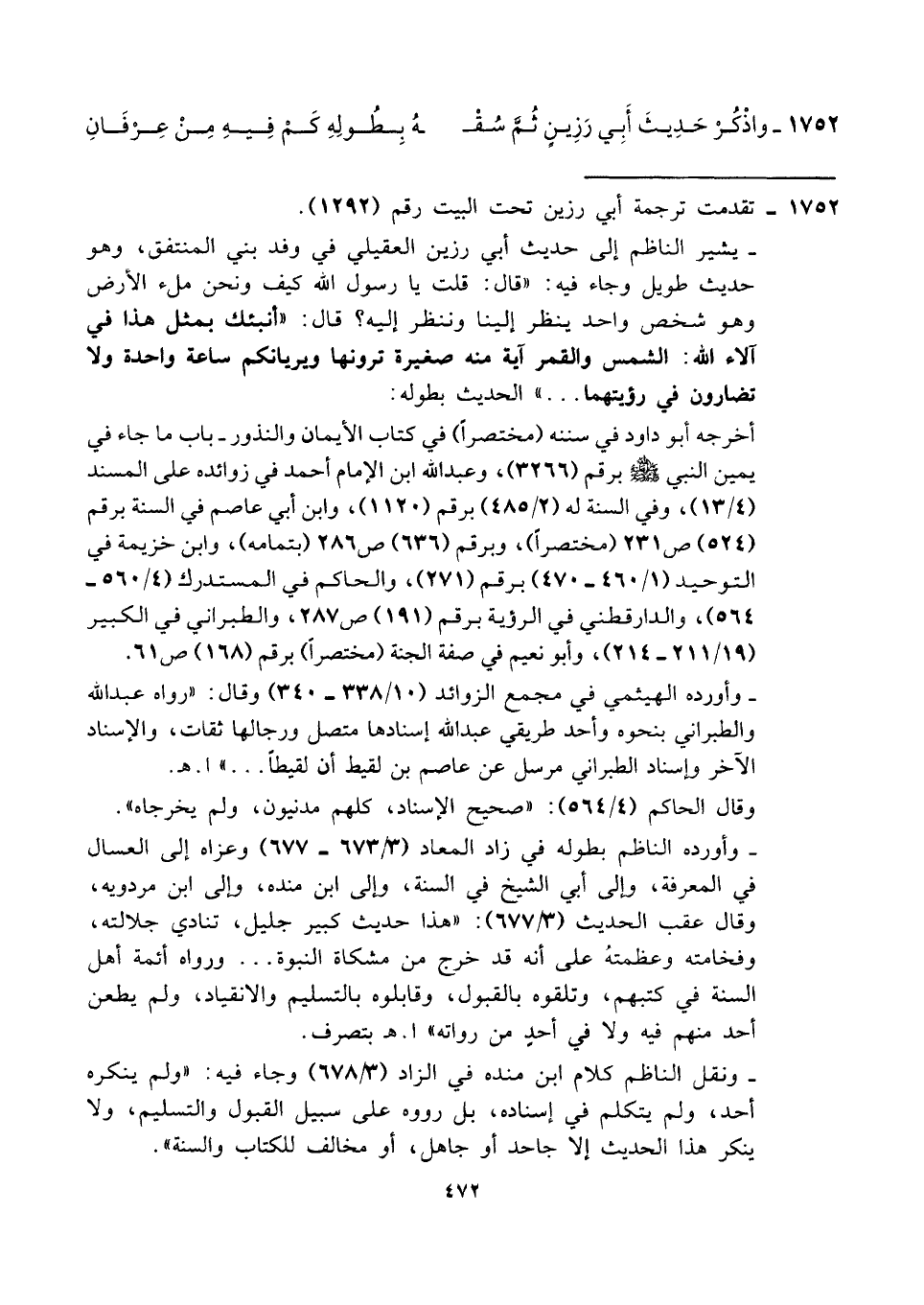 ١٧٥٢ - واذْكُرْ حَدِيثَ أَبِي رَزِينٍ ثُمَّ سُقْـ ... ـهُ بِطُولِهِ كَمْ فِيهِ مِنْ عِرْفَانِ