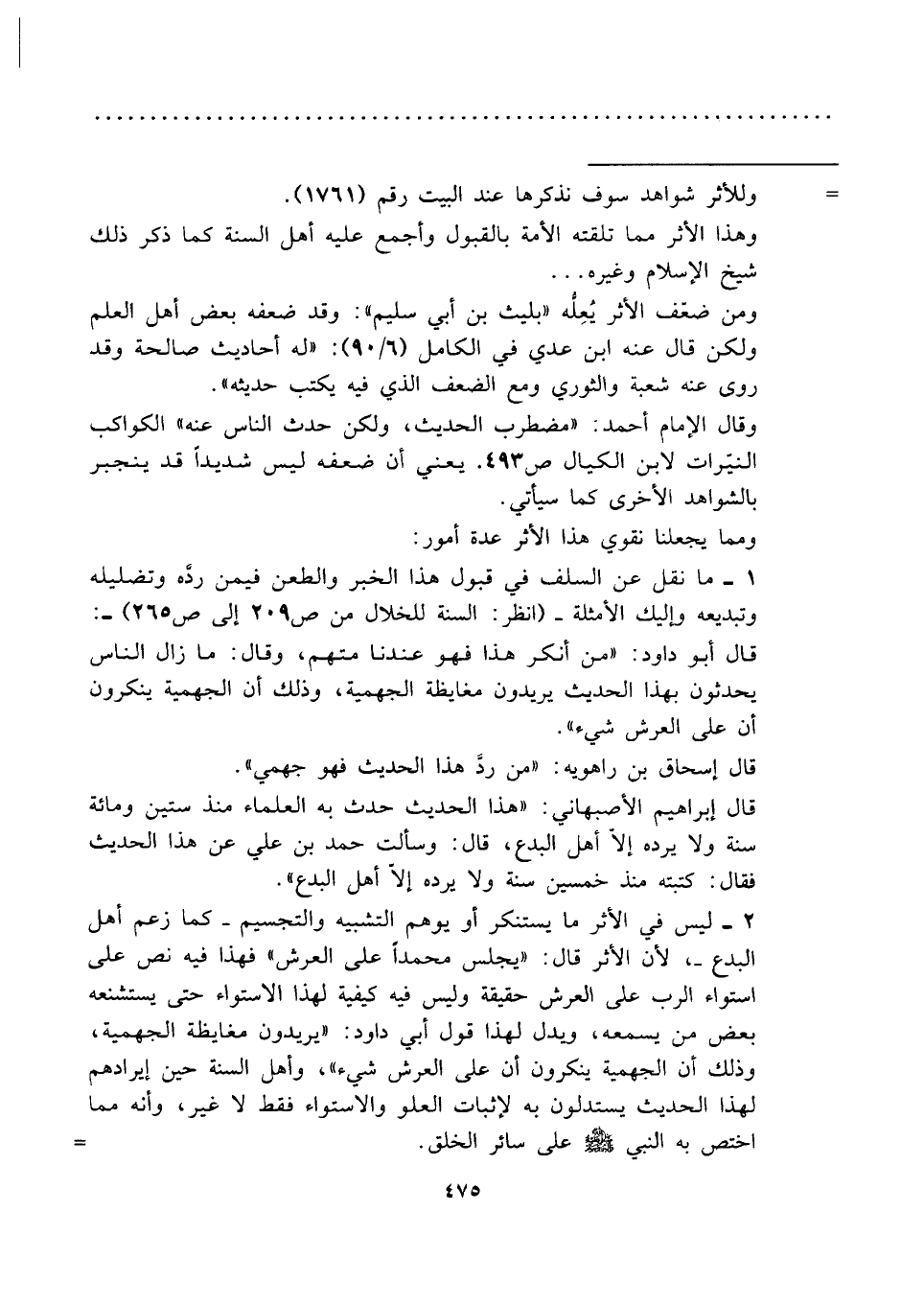 ٢ - ليس في الأثر ما يستنكر أو يوهم التشبيه والتجسيم -كما زعم أهل البدع-، لأن الأثر قال: "يجلس محمدًا على العرش" فهذا فيه نص على استواء الرب على العرش حقيقة وليس فيه كيفية لهذا الاستواء حتى يستشنعه بعض من يسمعه، ويدل لهذا قول أبي داود: "يريدون مغايظة الجهمية، وذلك أن الجهمية ينكرون أن على العرش شيء"، وأهل السنة حين إيرادهم لهذا الحديث يستدلون به لإثبات العلو والاستواء فقط لا غير، وأنه مما اختص به النبي - صلى الله عليه وسلم - على سائر الخلق. =