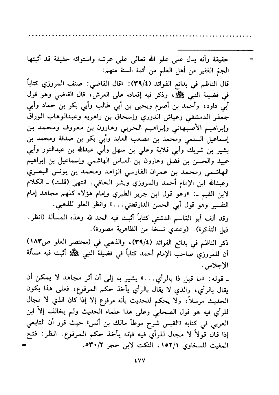 قال الناظم في بدائع الفوائد (٤/ ٣٩): "قال القاضي: صنف المروزي كتابًا في فضيلة النبي - صلى الله عليه وسلم -، وذكر فيه إقعاده على العرش، قال القاضي وهو قول أبي داود، وأحمد بن أصرم ويحيى بن أبي طالب وأبي بكر بن حماد وأبي جعفر الدمشقي وعياش الدوري وإسحاق بن راهويه وعبد الوهاب الوراق وإبراهيم الأصبهاني وإبراهيم الحربي وهارون بن معروف ومحمد بن إسماعيل السلمي ومحمد بن مصعب العابد وأبي بكر بن صدقة ومحمد بن بشير بن شريك وأبي قلابة وعلي بن سهل وأبي عبد الله بن عبد النور وأبي عبيد والحسن بن فضل وهارون بن العباس الهاشمي وإسماعيل بن إبراهيم الهاشمي ومحمد بن عمران الفارسي الزاهد ومحمد بن يونس البصري وعبد الله ابن الإمام أحمد والمروزي وبشر الحافي. انتهى (قلت) -الكلام لابن القيم-: "وهو قول ابن جرير الطبري وإمام هؤلاء كلهم مجاهد إمام التفسير وهو قول أبي الحسن الدارقطني ... " وانظر العلو للذهبي.