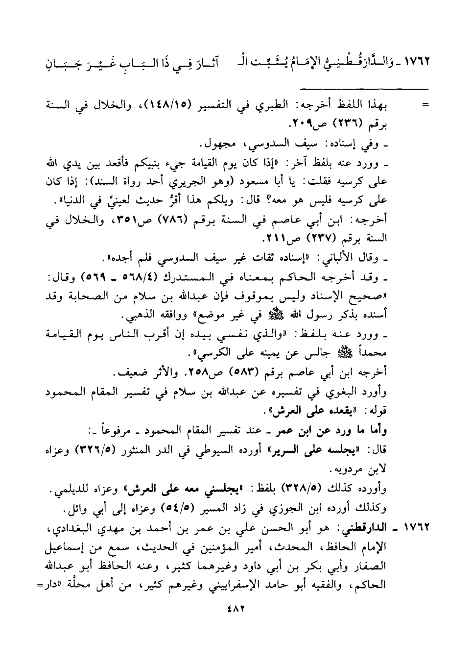 ١٧٦٢ - الدارقطني: هو أبو الحسن علي بن عمر بن أحمد بن مهدي البغدادي، الإمام الحافظ، المحدث، أمير المؤمنين في الحديث، سمع من إسماعيل الصفار وأبي بكر بن أبي داود وغيرهما كثير، وعنه الحافظ أبو عبد الله الحاكم، والفقيه أبو حامد الإسفراييني وغيرهم كثير، من أهل محلَّة "دار =