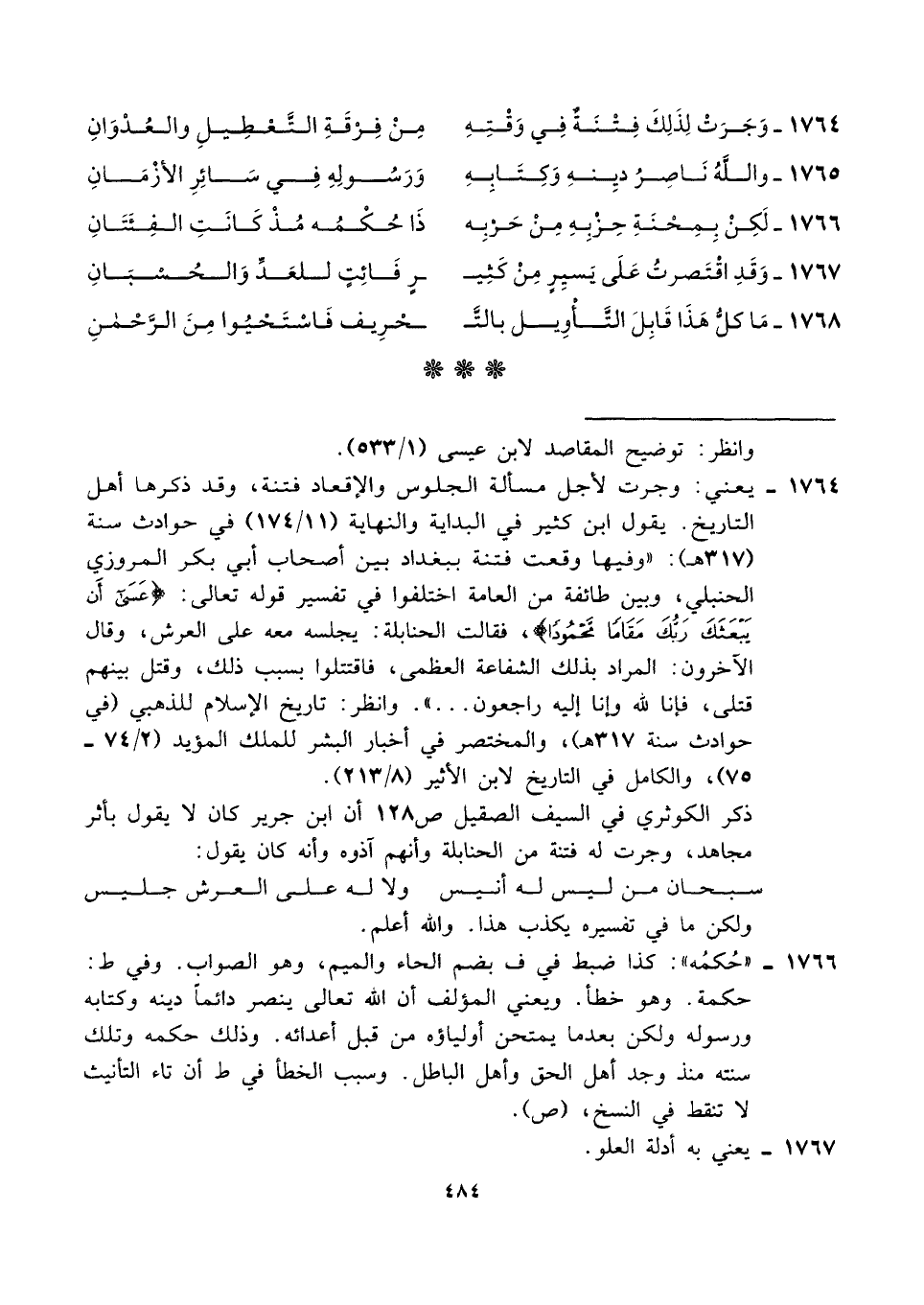 ١٧٦٤ - يعني: وجرت لأجل مسألة الجلوس والإقعاد فتنة، وقد ذكرها أهل التاريخ. يقول ابن كثير في البداية والنهاية (١١/ ١٧٤) في حوادث سنة (٣١٧ هـ): "وفيها وقعت فتنة ببغداد بين أصحاب أبي بكر المروزي الحنبلي، وبين طائفة من العامة اختلفوا في تفسير قوله تعالى: {عَسَى أَنْ يَبْعَثَكَ رَبُّكَ مَقَامًا مَحْمُودًا}، فقالت الحنابلة: يجلسه معه على العرش، وقال الآخرون: المراد بذلك الشفاعة العظمى، فاقتتلوا بسبب ذلك، وقتل بينهم قتلى، فإنا لله وإنا إليه راجعون ... ". وانظر: تاريخ الإسلام للذهبي (في حوادث سنة ٣١٧ هـ)، والمختصر في أخبار البشر للملك المؤيد (٢/ ٧٤ - ٧٥)، والكامل في التاريخ لابن الأثير (٨/ ٢١٣).