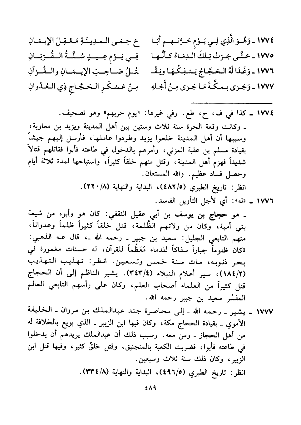 ١٧٧٧ - يشير -رحمه الله- إلى محاصرة جند عبد الملك بن مروان -الخليفة الأموي- بقيادة الحجاج مكة، وكان فيها ابن الزبير -الذي بويع بالخلافة له من أهل الحجاز- ومن معه. وسبب ذلك أن عبد الملك يريدهم أن يدخلوا في طاعته فأبوا، فضربت الكعبة بالمنجنيق، وقتل خلق كثير، وفيها قتل ابن الزبير، وكان ذلك سنة ثلاث وسبعين.