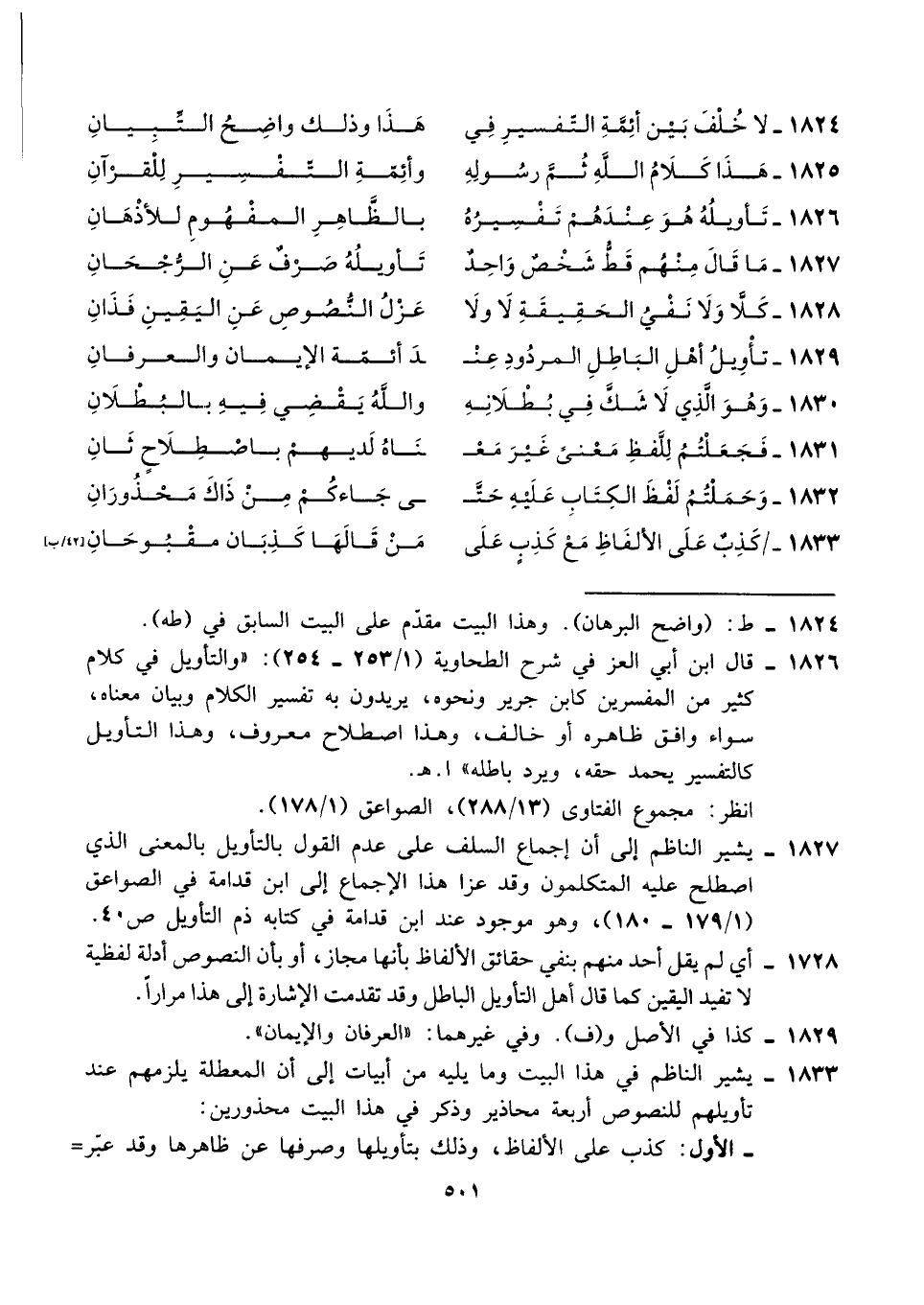 ١٨٢٧ - يشير الناظم إلى أن إجماع السلف على عدم القول بالتأويل بالمعنى الذي اصطلح عليه المتكلمون وقد عزا هذا الإجماع إلى ابن قدامة في الصواعق (١/ ١٧٩ - ١٨٠)، وهو موجود عند ابن قدامة في كتابه ذم التأويل ص ٤٠.