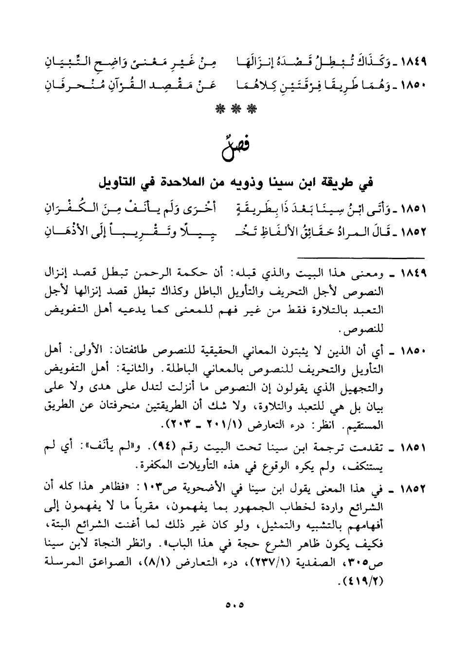 ١٨٥١ - تقدمت ترجمة ابن سينا تحت البيت رقم (٩٤). و"لم يأنَف": أي لم يستنكف، ولم يكره الوقوع في هذه التأويلات المكفرة.