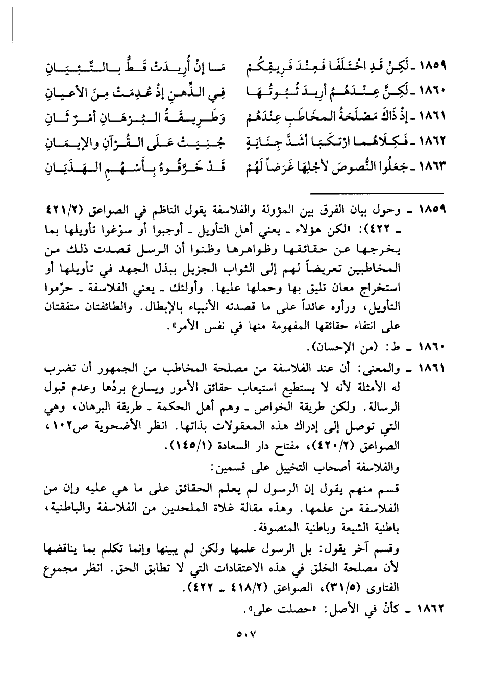 ١٨٥٩ - وحول بيان الفرق بين المؤولة والفلاسفة يقول الناظم في الصواعق (٢/ ٤٢١ - ٤٢٢): "لكن هؤلاء -يعني أهل التأويل- أوجبوا أو سوغوا تأويلها بما يخرجها عن حقائقها وظواهرها وظنوا أن الرسل قصدت ذلك من المخاطبين تعريضًا لهم إلى الثواب الجزيل ببذل الجهد في تأويلها أو استخراج معان تليق بها وحملها عليها. وأولئك -يعني الفلاسفة- حرموا التأويل، ورأوه عائدًا على ما قصدته الأنبياء بالإبطال. والطائفتان متفقتان على انتفاء حقائقها المفهومة منها في نفس الأمر".