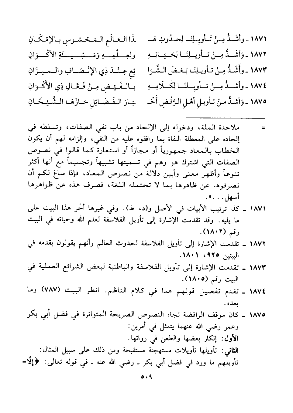 ١٨٧١ - كذا ترتيب الأبيات في الأصل و (د، ط). وفي غيرها أخّر هذا البيت على ما يليه. وقد تقدمت الإشارة إلى تأويل الفلاسفة لعلم الله وحياته في البيت رقم (١٨٠٢).