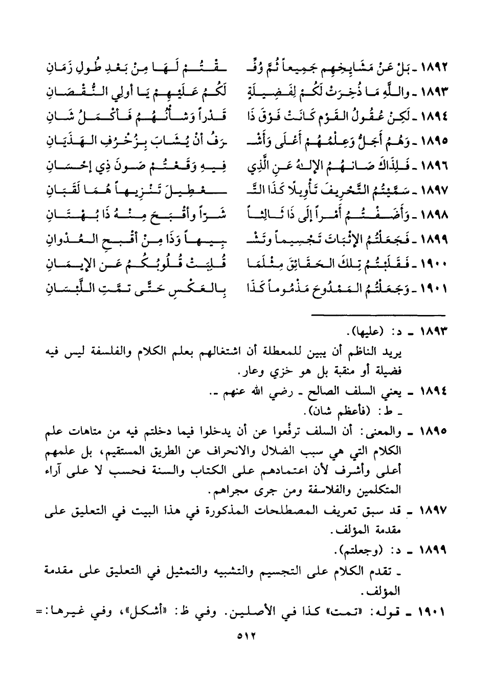 ١٨٩٥ - والمعنى: أن السلف ترفعوا عن أن يدخلوا فيما دخلتم فيه من متاهات علم الكلام التي هي سبب الضلال والانحراف عن الطريق المستقيم، بل علمهم أعلى وأشرف لأن اعتمادهم على الكتاب والسنة فحسب لا على آراء المتكلمين والفلاسفة ومن جرى مجراهم.