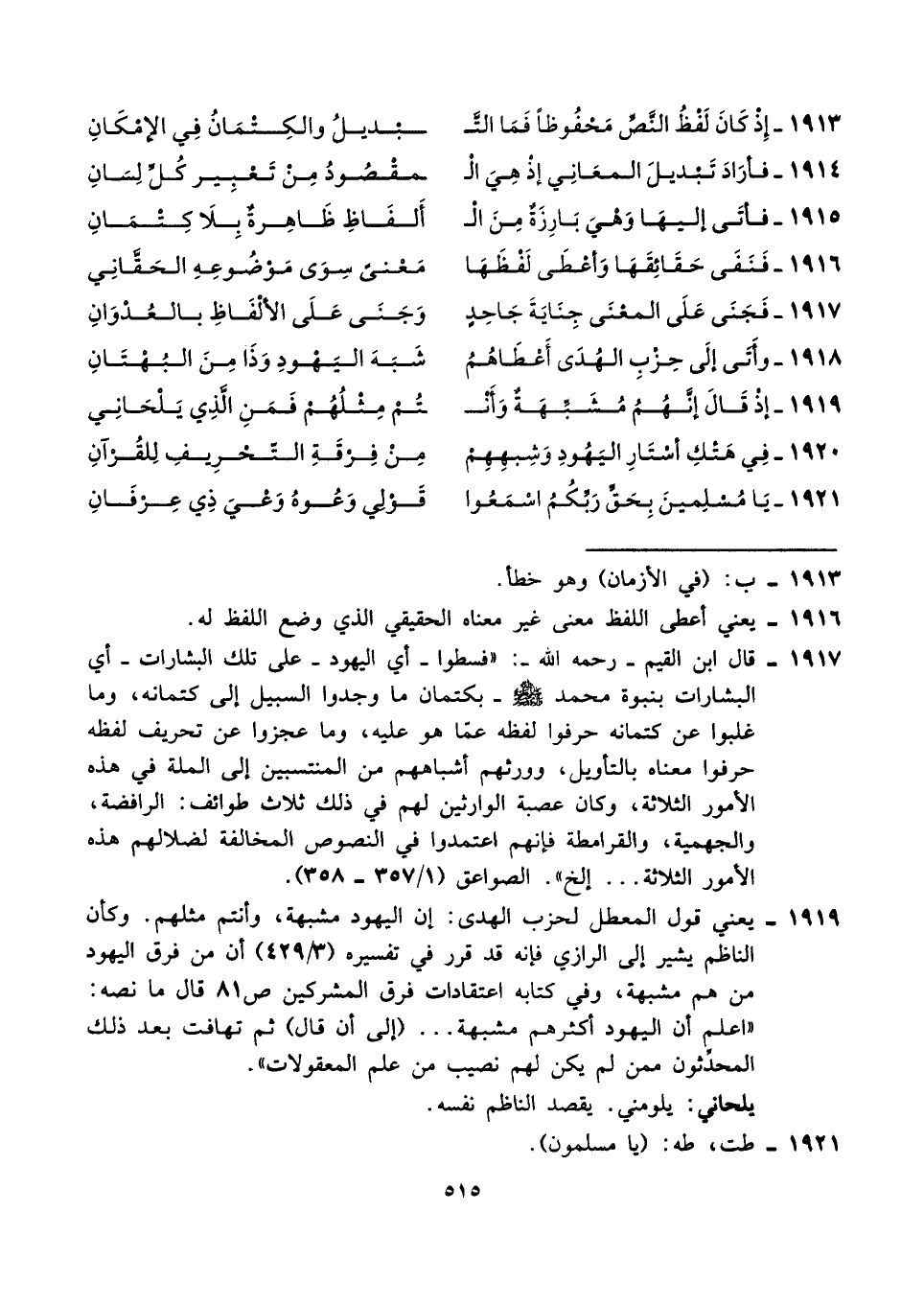 ١٩١٣ - إِذْ كَانَ لَفْظُ النَّصِّ مَحْفُوظًا فَمَا التَّـ ... ـبْديلُ والكِتْمَانُ فِي الإمْكَانِ