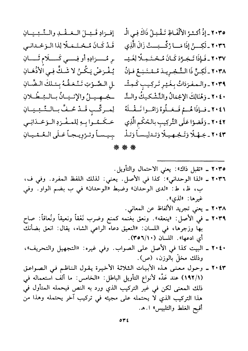 ٢٠٣٦ - "لذا الوحداني": كذا في الأصل. يعني: لذلك اللفظ المفرد. وفي ف، ب، ظ، ط: "لدى الوحدان" وضبط "الوحدان" في ب بضم الواو. وفي غيرها: "لذي".