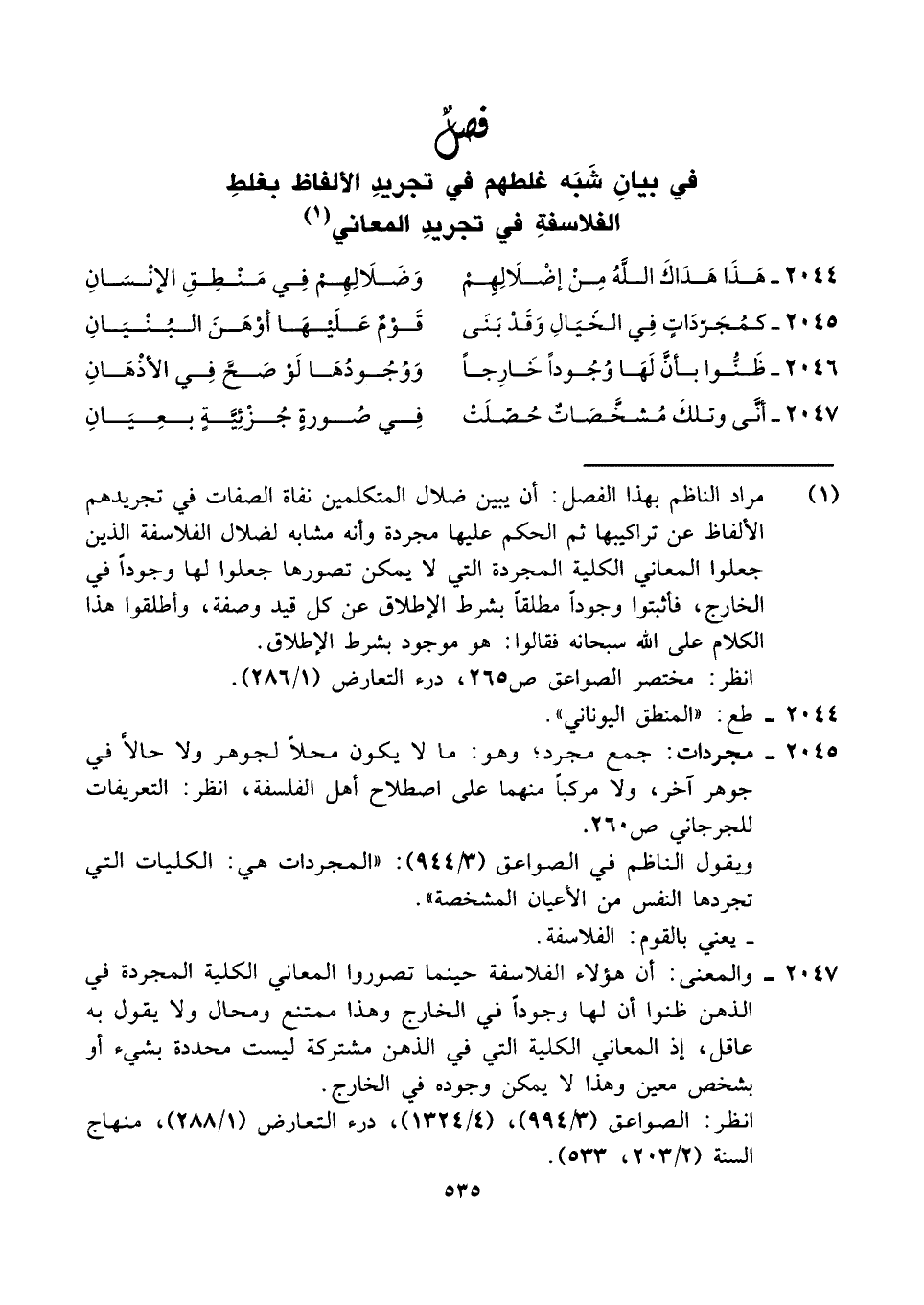 ٢٠٤٥ - مجردات: جمع مجرد؛ وهو: ما لا يكون محلًا لجوهر ولا حالًا في جوهر آخر، ولا مركبًا منهما على اصطلاح أهل الفلسفة، انظر: التعريفات للجرجاني ص ٢٦٠.