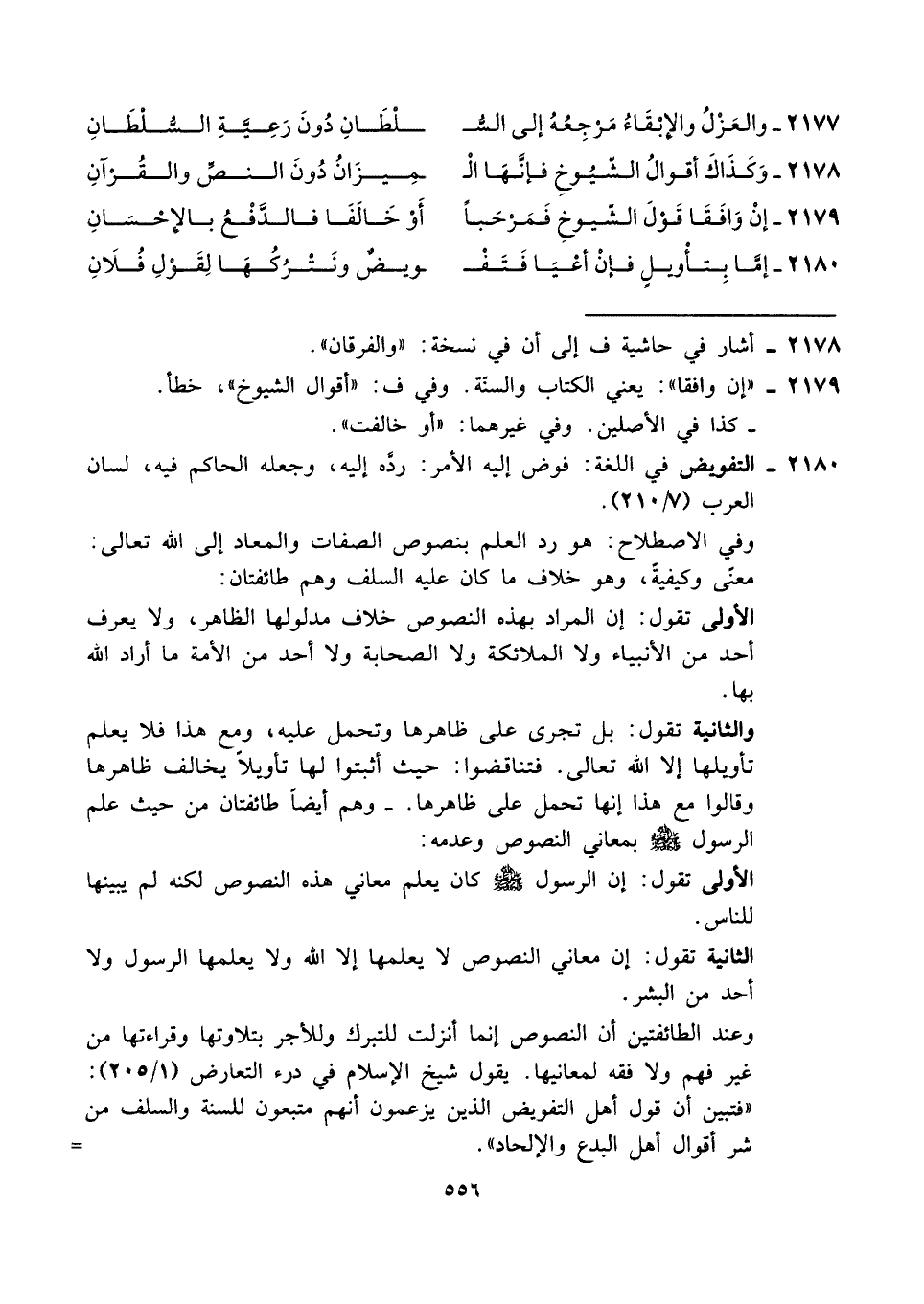 ٢١٨٠ - إمَّا بِتأْويلٍ فإنْ أعْيَا فَتَفْـ ... ـويضٌ ونَتْرُكْهَا لِقَوْلِ فُلَانِ