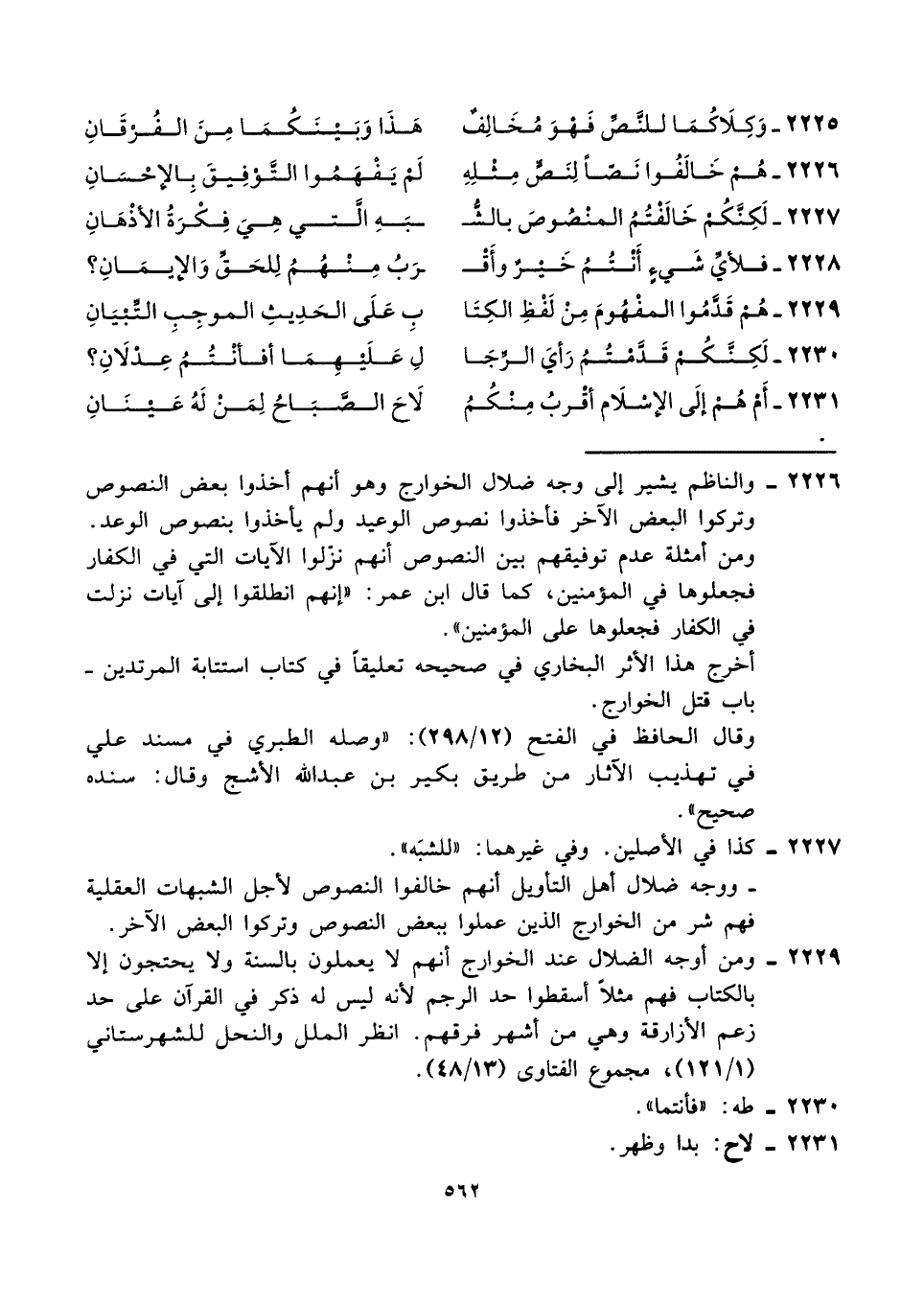 ٢٢٢٦ - والناظم يشير إلى وجه ضلال الخوارج وهو أنهم أخذوا بعض النصوص وتركوا البعض الآخر فأخذوا نصوص الوعيد ولم يأخذوا بنصوص الوعد. ومن أمثلة عدم توفيقهم بين النصوص أنهم نزّلوا الآيات التي في الكفار فجعلوها في المؤمنين، كما قال ابن عمر: "إنهم انطلقوا إلى آيات نزلت في الكفار فجعلوها على المؤمنين".