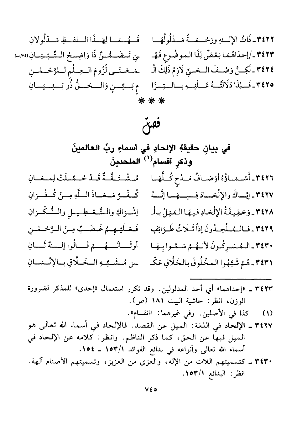 ٣٤٢٩ - فالمُلْحِدُونَ إذًا ثَلَاثُ طَوَائِفٍ ... فَعَلَيْهِمُ غَضَبٌ مِنْ الرَّحْمنِ