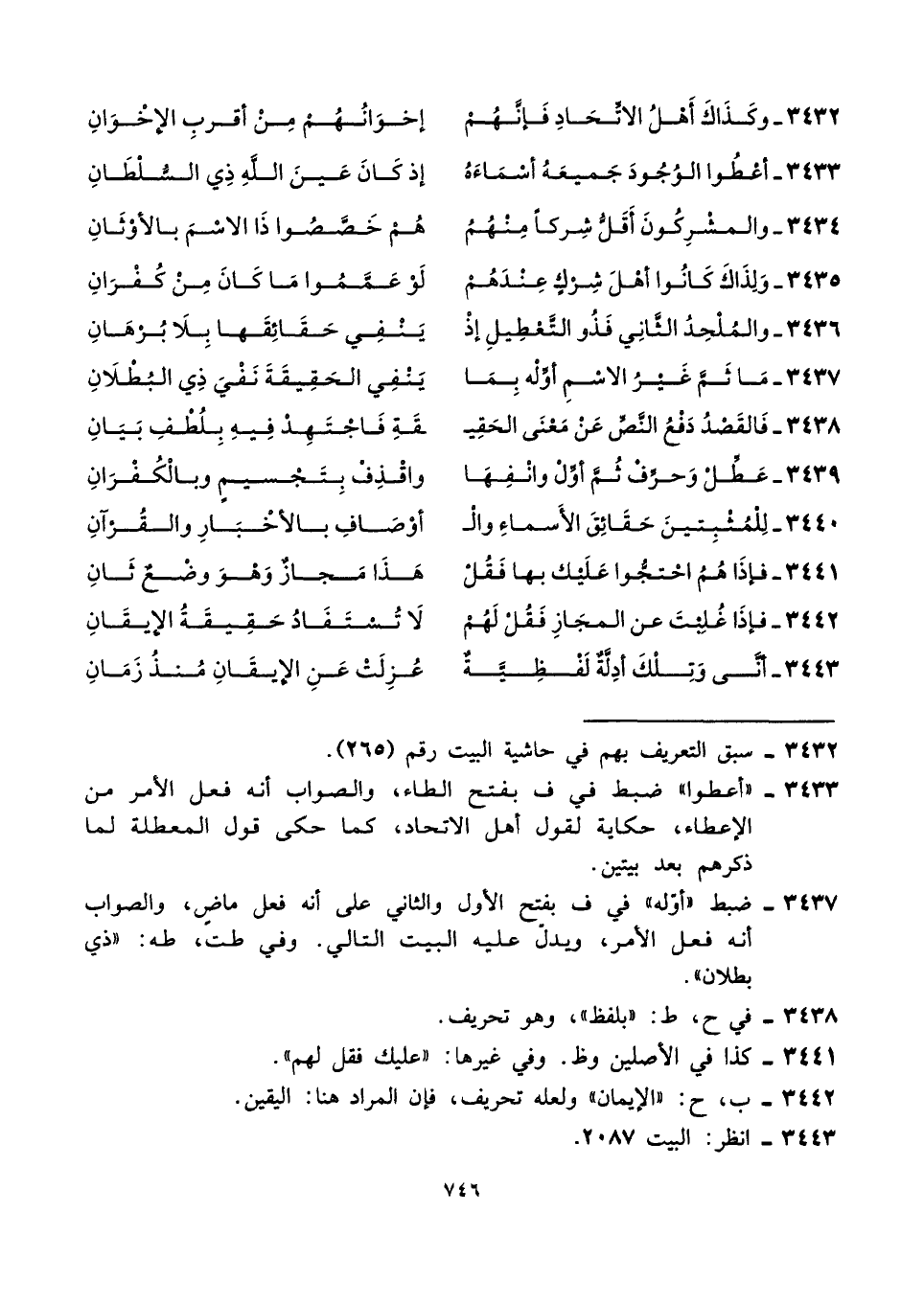 ٣٤٣٣ - "أعطوا" ضبط في ف بفتح الطاء، والصواب أنه فعل الأمر من الإعطاء، حكاية لقول أهل الاتحاد، كما حكى قول المعطلة لما ذكرهم بعد بيتين.