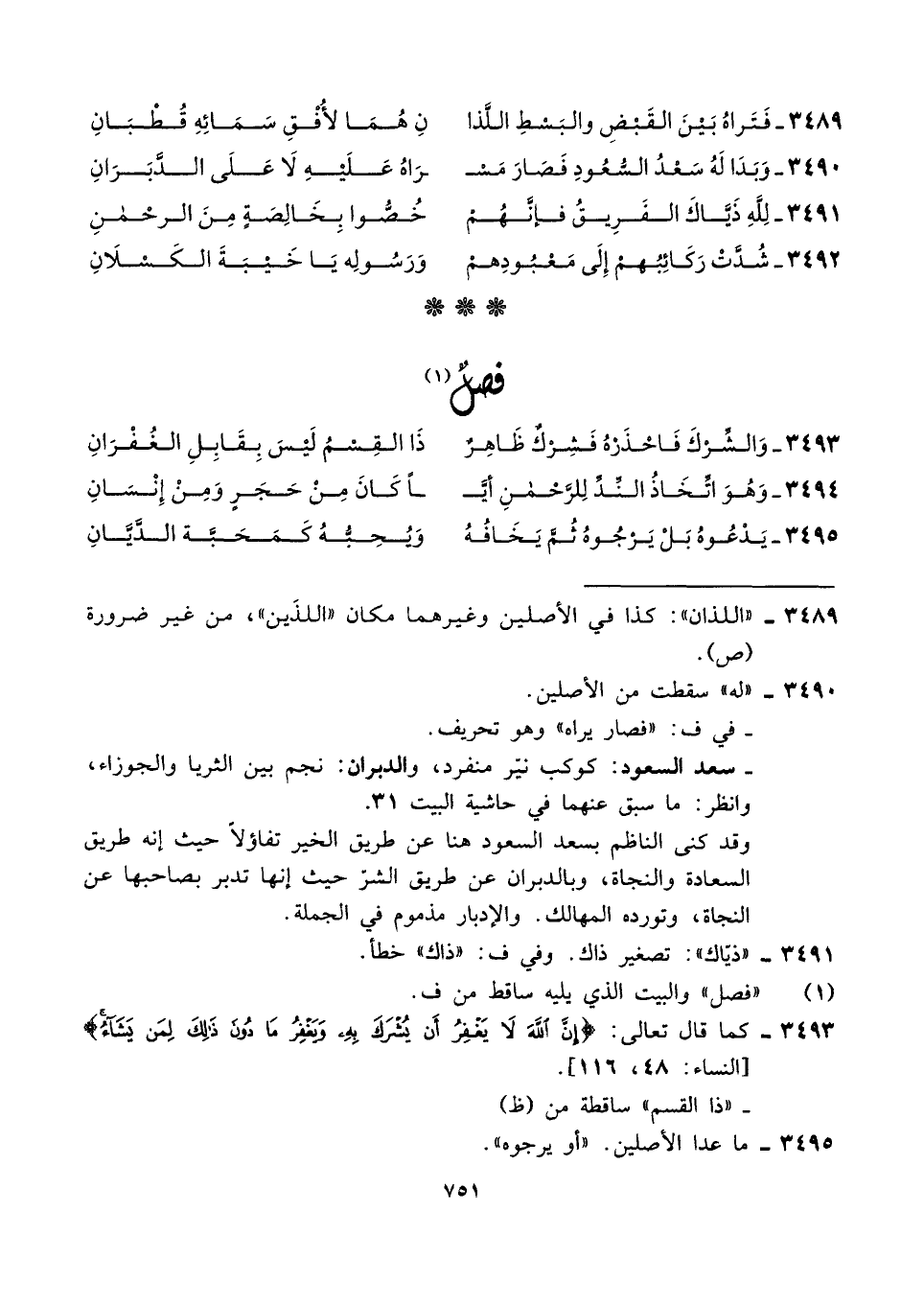 وقد كنى الناظم بسعد السعود هنا عن طريق الخير تفاؤلًا حيث إنه طريق السعادة والنجاة، وبالدبران عن طريق الشرّ حيث إنها تدبر بصاحبها عن النجاة، وتورده المهالك. والإدبار مذموم في الجملة.