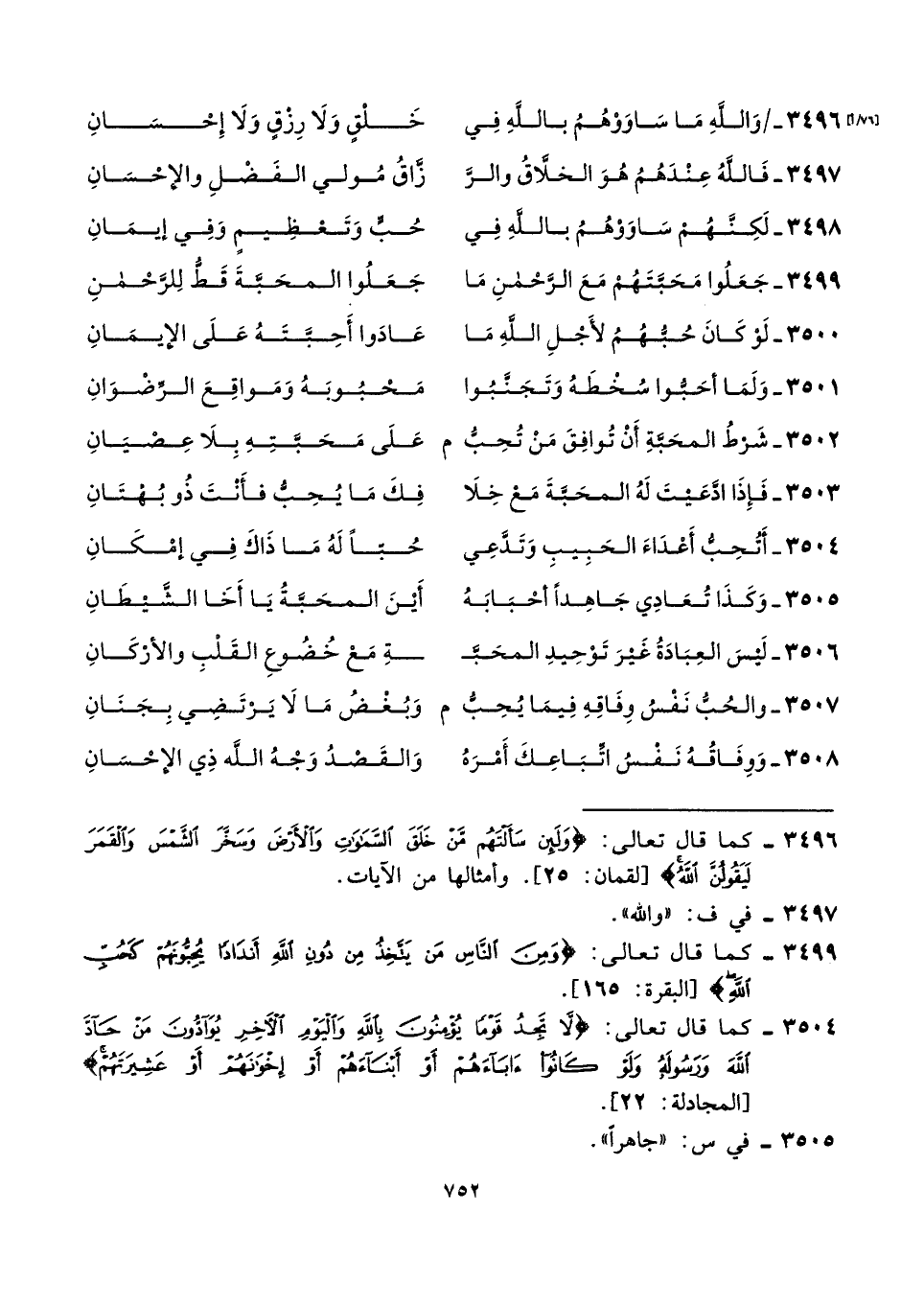 ٣٤٩٩ - كما قال تعالى: {وَمِنَ النَّاسِ مَنْ يَتَّخِذُ مِنْ دُونِ اللهِ أَنْدَادًا يُحِبُّونَهُمْ كَحُبِّ اللهِ} [البقرة: ١٦٥].