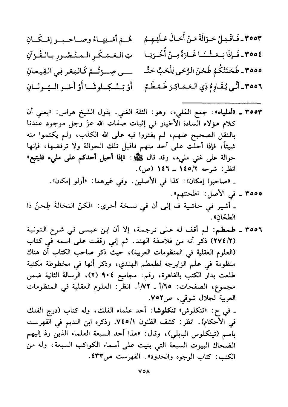 ٣٥٥٣ - "أملياء": جمع المَليء، وهو: الثقة الغني. يقول الشيخ هراس: "يعني أن كلام هؤلاء السادة الأخيار في إثبات صفات الله عزّ وجل موجود عندنا بالنقل الصحيح عنهم، لم يفتروا فيه على الله الكذب، ولم يكتموا منه شيئًا، فإذا أحلت على أحد منهم فاقبل تلك الحوالة ولا ترفضها، فإنها حوالة على غني مليء، وقد قال - صلى الله عليه وسلم -: "إذا أحيل أحدكم على مليء فليتبع"