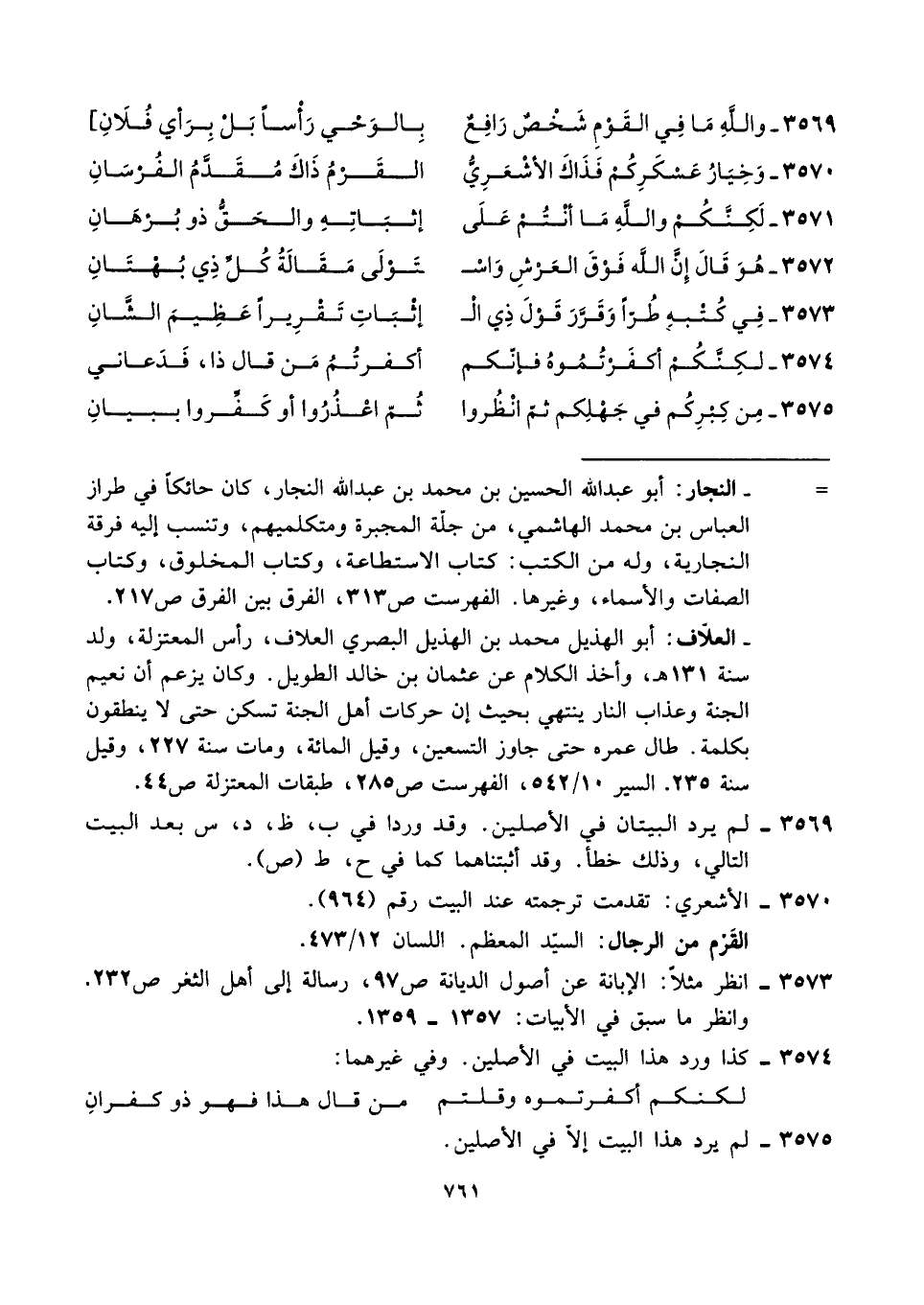 ٣٥٧٣ - انظر مثلًا: الإبانة عن أصول الديانة ص ٩٧، رسالة إلى أهل الثغر ص ٢٣٢. وانظر ما سبق في الأبيات: ١٣٥٧ - ١٣٥٩.