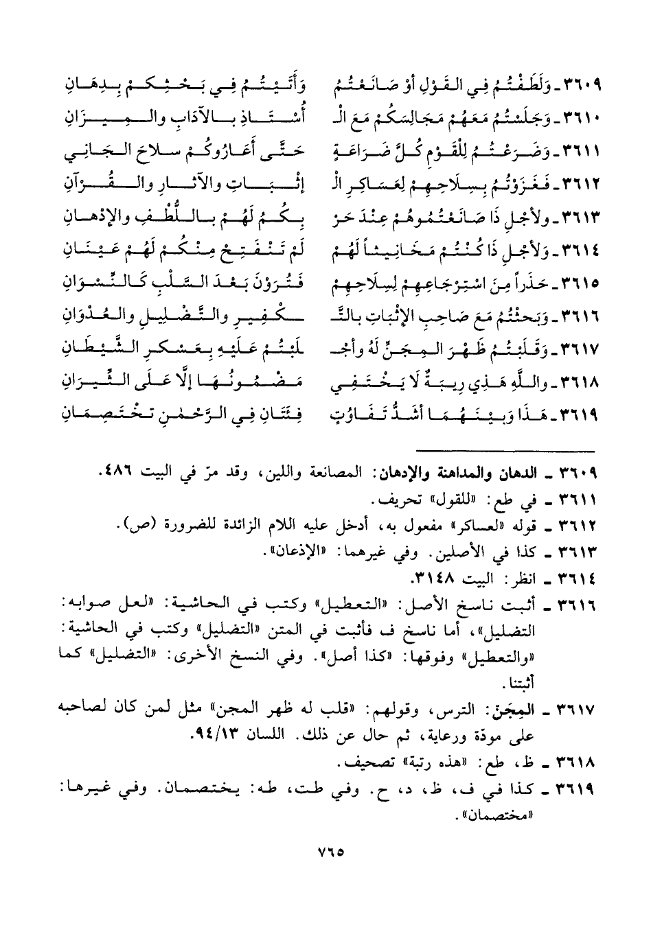 ٣٦٠٩ - الدهان والمداهنة والإدهان: المصانعة واللين، وقد مرّ في البيت ٤٨٦.