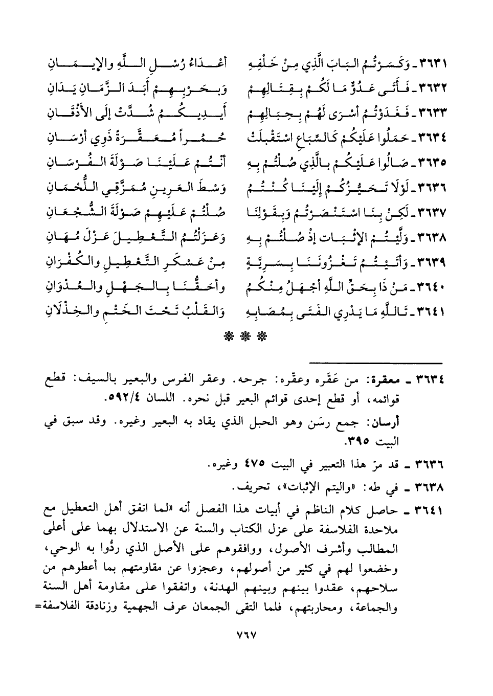 ٣٦٤١ - حاصل كلام الناظم في أبيات هذا الفصل أنه "لما اتفق أهل التعطيل مع ملاحدة الفلاسفة على عزل الكتاب والسنة عن الاستدلال بهما على أعلى المطالب وأشرف الأصول، ووافقوهم على الأصل الذي ردُّوا به الوحي، وخضعوا لهم في كثير من أصولهم، وعجزوا عن مقاومتهم بما أعطوهم من سلاحهم، عقدوا بينهم وبينهم الهدنة، واتفقوا على مقاومة أهل السنة والجماعة، ومحاربتهم، فلما التقى الجمعان عرف الجهمية وزنادقة الفلاسفة =
