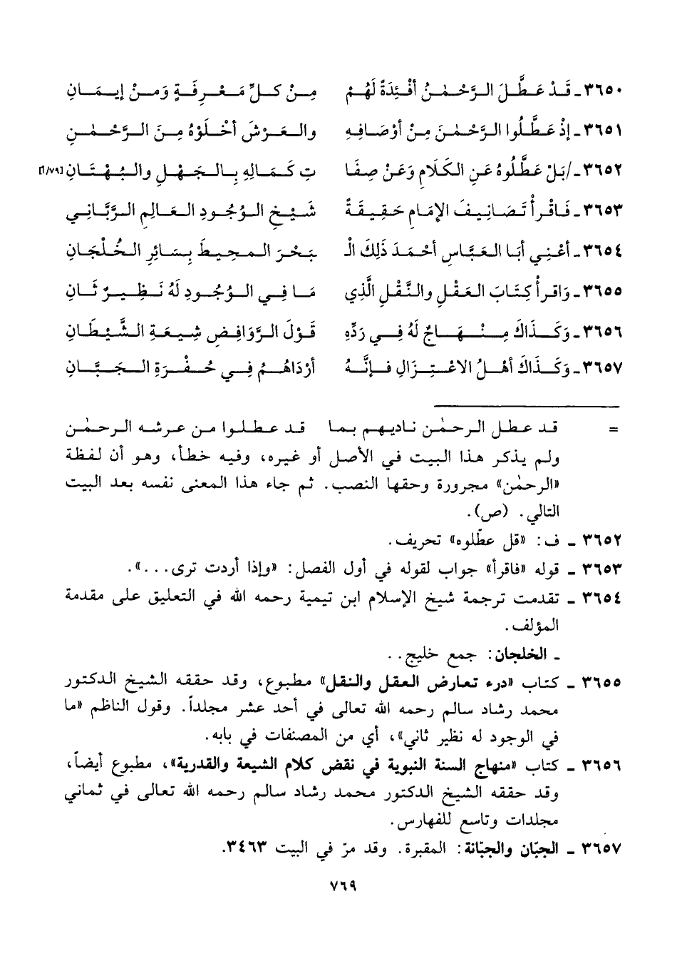٣٦٥٥ - كتاب "درء تعارض العقل والنقل" مطبوع، وقد حققه الشيخ الدكتور محمد رشاد سالم رحمه الله تعالى في أحد عشر مجلدًا. وقول الناظم "ما في الوجود له نظير ثاني"، أي من المصنفات في بابه.