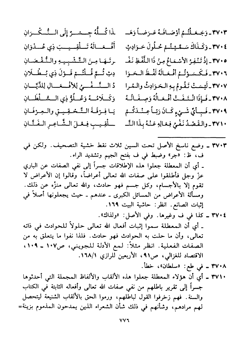 - أي أن المعطلة جعلوا هذه الإطلاقات جسرًا إلى نفي الصفات عن الباري عزّ وجل فأطلقوا على صفات الله تعالى أعراضًا، وقالوا إن الأعراض لا تقوم إلا بالأجسام، وكل جسم فهو حادث، والله تعالى منزَّه عن ذلك. ومسألة الأعراض من المسائل الكبرى -عندهم- حيث يجعلونها أصلًا في إثبات الصانع. انظر: حاشية البيت ١٦٩.