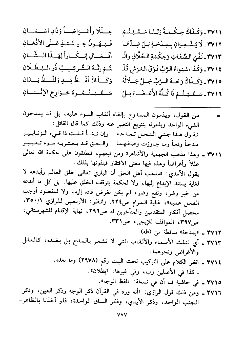 ٣٧١١ - وَكَذَاكَ حِكْمَةُ رَبِّنَا سَمَّيتُمُ ... عِلَلًا وأَغرَاضًا وَذَانِ اسْمَانِ